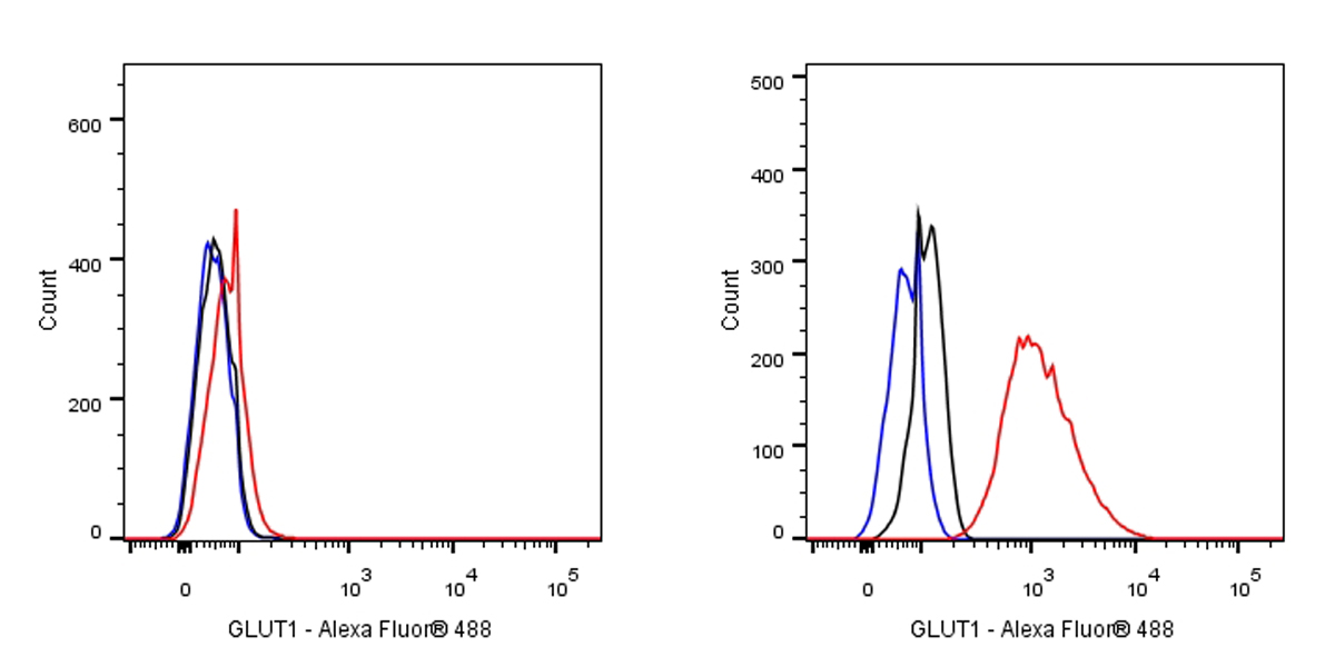 Flow cytometric analysis of 4% PFA fixed 90% methanol permeabilized Molt-4 (Human lymphoblastic leukemia T lymphoblast, left) / HT-29 (Human colorectal adenocarcinoma epithelial cell, right) cells labelling GLUT1 antibody at 1/250 dilution (0.1 μg) / (red) compared with a Rabbit monoclonal IgG (Black) isotype control and an unlabelled control (cells without incubation with primary antibody and secondary antibody) (Blue). Goat Anti - Rabbit IgG Alexa Fluor® 488 was used as the secondary antibody.