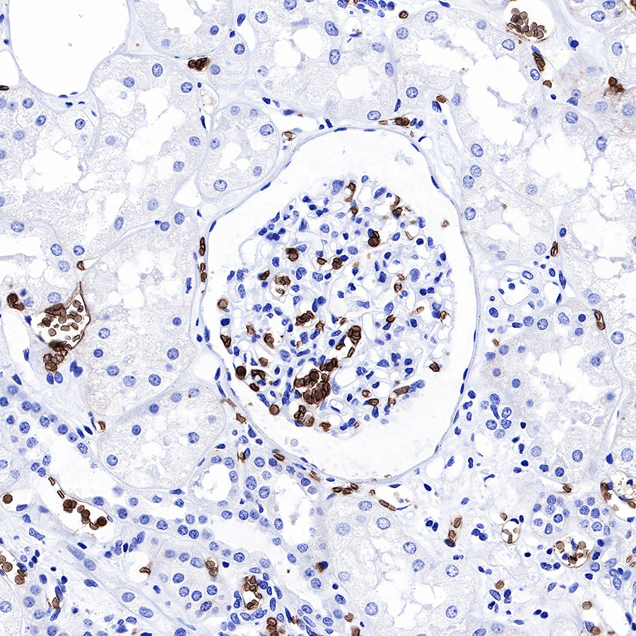 IHC shows positive staining in paraffin-embedded human kidney. Anti-GLUT1 antibody was used at 1/1000 dilution, followed by a HRP Polymer for Mouse & Rabbit IgG (ready to use). Counterstained with hematoxylin. Heat mediated antigen retrieval with Tris/EDTA buffer pH9.0 was performed before commencing with IHC staining protocol.