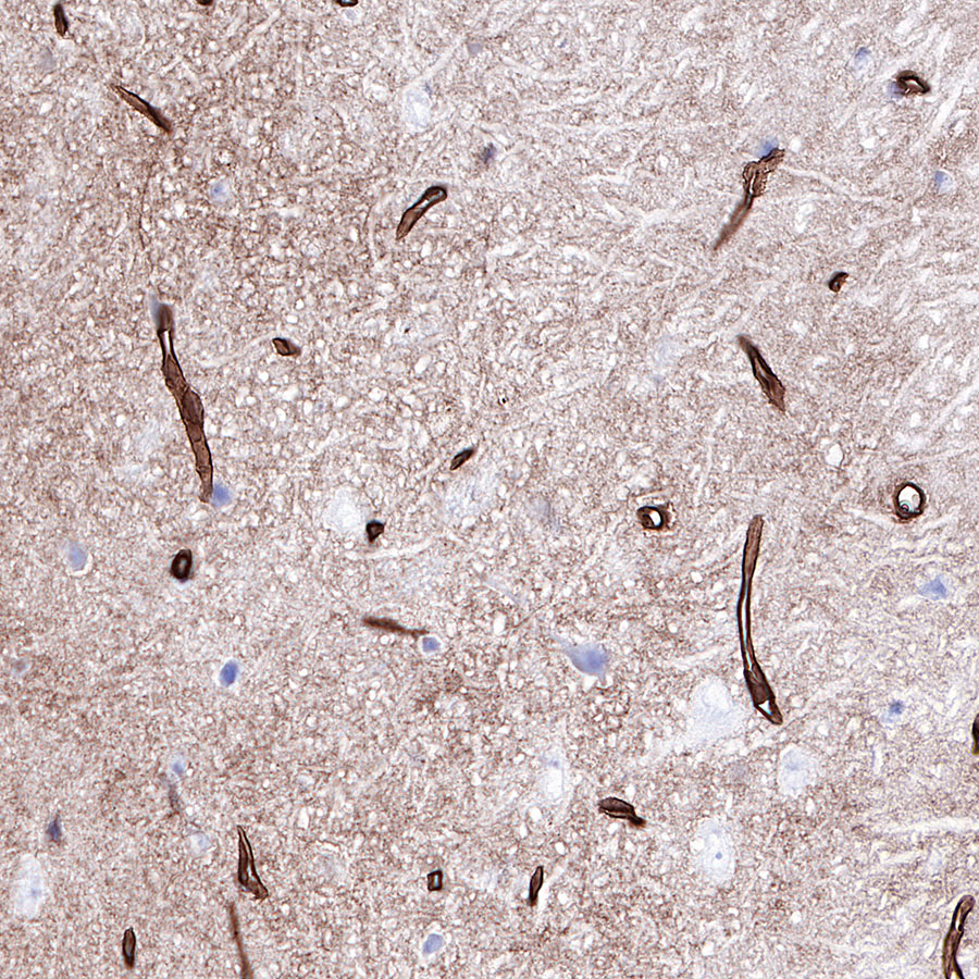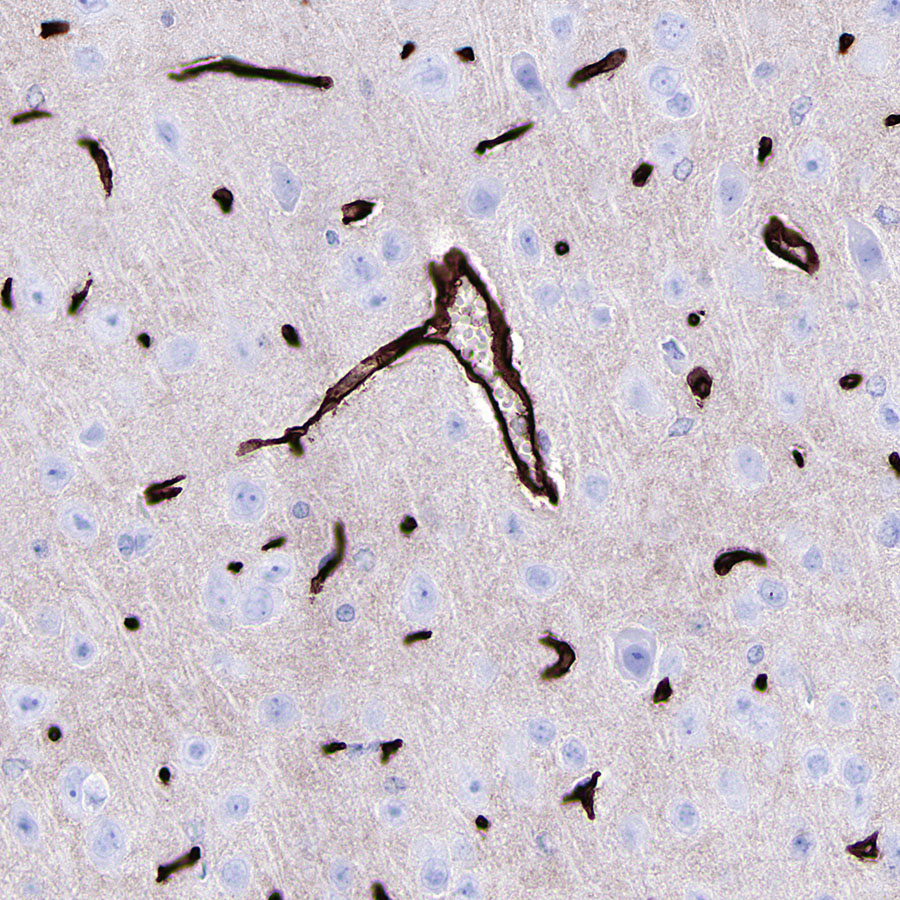 IHC shows positive staining in paraffin-embedded mouse cerebral cortex. Anti-GLUT1 antibody was used at 1/1000 dilution, followed by a HRP Polymer for Mouse & Rabbit IgG (ready to use). Counterstained with hematoxylin. Heat mediated antigen retrieval with Tris/EDTA buffer pH9.0 was performed before commencing with IHC staining protocol.