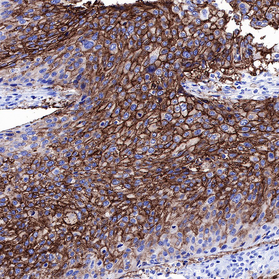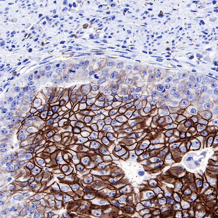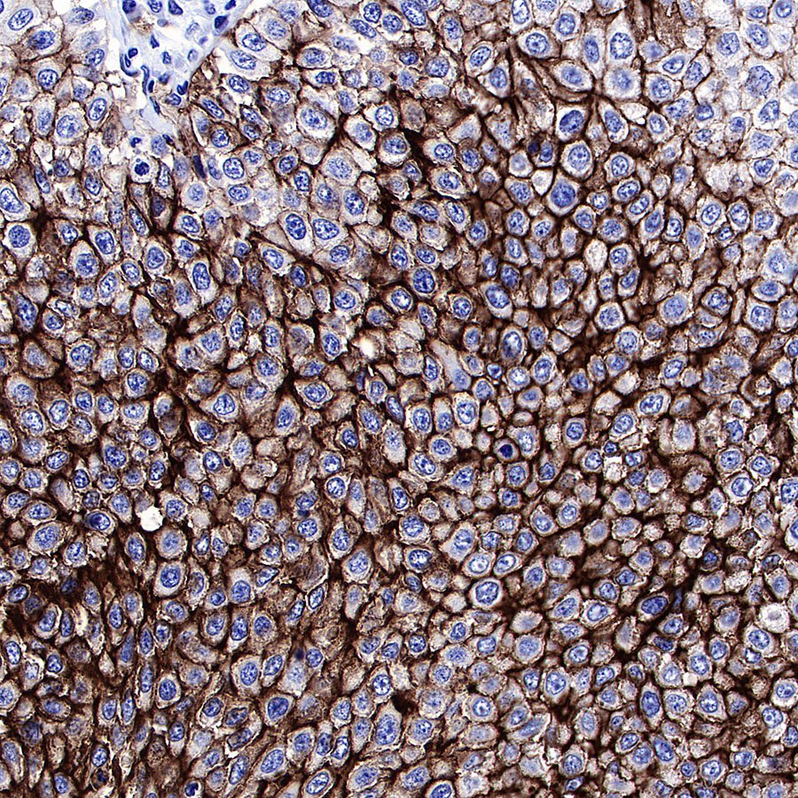 IHC shows positive staining in paraffin-embedded human lung squamous cell carcinoma. Anti-GLUT1 antibody was used at 1/1000 dilution, followed by a HRP Polymer for Mouse & Rabbit IgG (ready to use). Counterstained with hematoxylin. Heat mediated antigen retrieval with Tris/EDTA buffer pH9.0 was performed before commencing with IHC staining protocol.