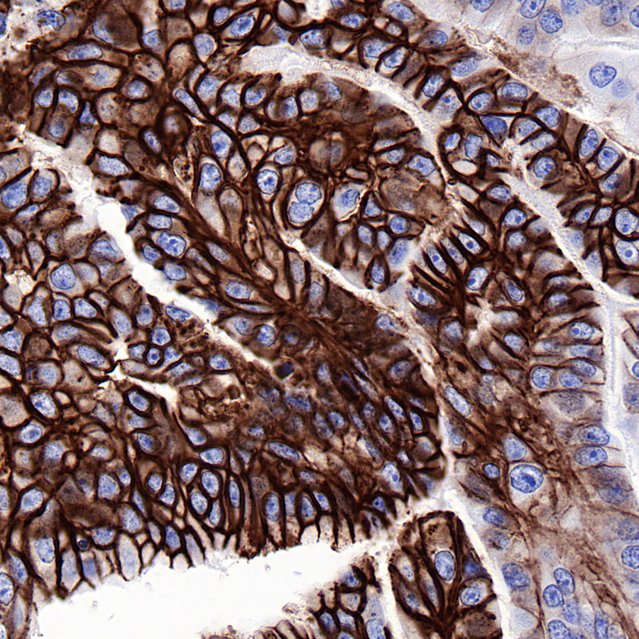 IHC shows positive staining in paraffin-embedded human ovarian carcinoma. Anti-GLUT1 antibody was used at 1/1000 dilution, followed by a HRP Polymer for Mouse & Rabbit IgG (ready to use). Counterstained with hematoxylin. Heat mediated antigen retrieval with Tris/EDTA buffer pH9.0 was performed before commencing with IHC staining protocol.