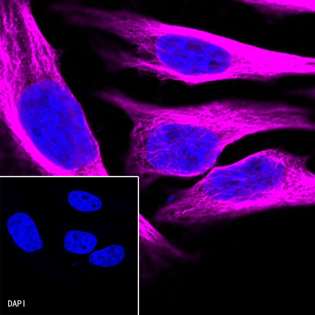 ICC shows positive staining in HeLa cells. Anti-α-tubulin antibody (S0B0043) was used at 1/100 dilution (magenta) and incubated overnight at 4°C. Goat anti-Rabbit IgG (H+L) (Alexa Fluor® 647 Conjugate) was used as secondary antibody at 1/500 dilution. The cells were fixed with 4% PFA and permeabilized with 0.1% PBS-Triton X-100. Nuclei were counterstained with DAPI (Blue).