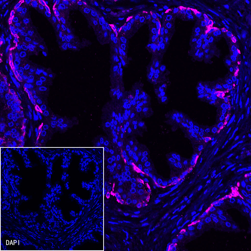 IF shows positive staining in paraffin-embedded human prostate. Anti-CK5/6 antibody was used at 1/500 dilution (magenta) and incubated overnight at 4°C. Goat anti-Rabbit IgG (H+L) (Alexa Fluor® 647 Conjugate) (S0B4005) was used at 1/500 dilution. Counterstained with DAPI (Blue). Heat mediated antigen retrieval with EDTA buffer pH9.0 was performed before commencing with IF staining protocol.