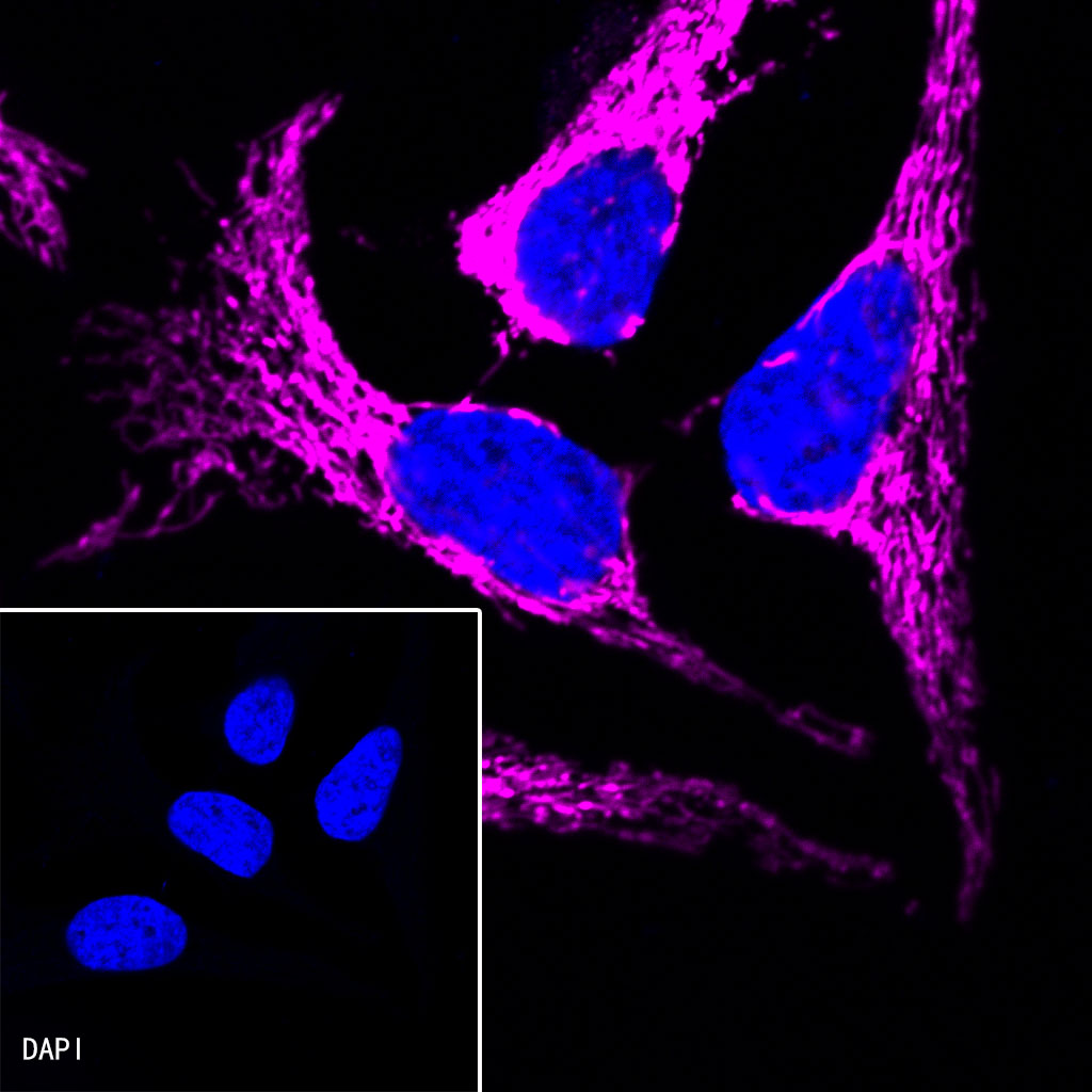 ICC shows positive staining in HeLa cells. Anti-HSP60 antibody (S0B0002) was used at 1/500 dilution (magenta) and incubated overnight at 4°C. Goat anti-Rabbit IgG (H+L) (Alexa Fluor® 647 Conjugate) was used as secondary antibody at 1/500 dilution. The cells were fixed with 4% PFA and permeabilized with 0.1% PBS-Triton X-100. Nuclei were counterstained with DAPI (Blue).
