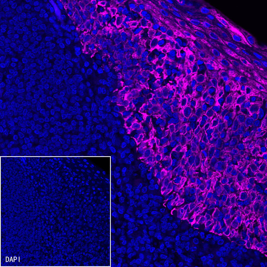 IF shows positive staining in paraffin-embedded human tonsil. Anti-CK5/6 antibody was used at 1/500 dilution (magenta) and incubated overnight at 4°C. Goat anti-Rabbit IgG (H+L) (Alexa Fluor® 647 Conjugate) (S0B4005) was used at 1/500 dilution. Counterstained with DAPI (Blue). Heat mediated antigen retrieval with EDTA buffer pH9.0 was performed before commencing with IF staining protocol.