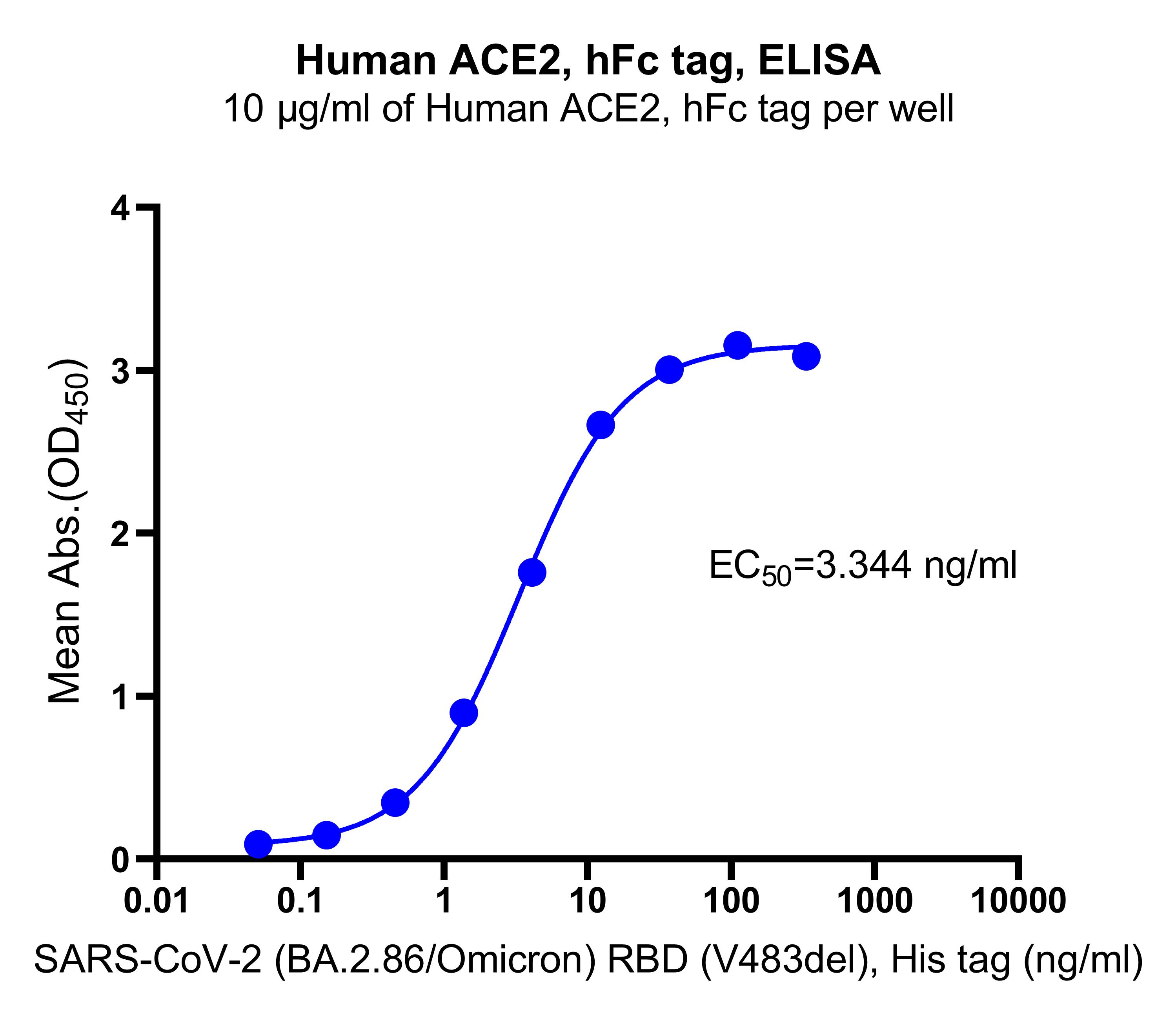 Immobilized Human ACE2, hFc tag at 10 μg/mL (50 μL/well) can bind SARS-CoV-2 (BA.2.86/Omicron) RBD (V483del) (Cat. No. S0A2073), His tag with EC50 of 2.942-3.794 ng/ml.