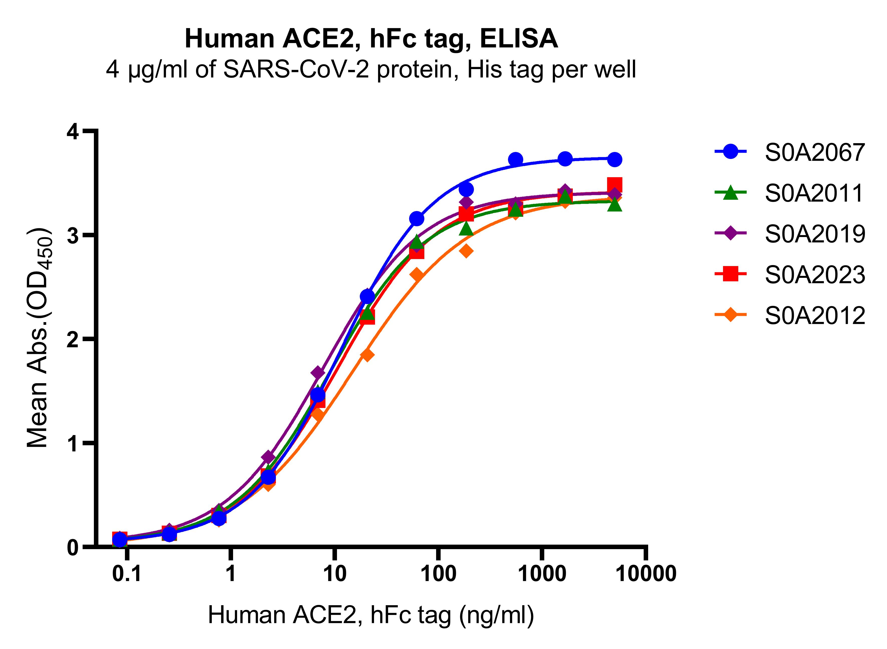 5. Immobilized SARS-CoV-2 (BA.2/Omicron) S protein, His tag (S0A2023) at 4 μg/mL (50 μL/well) can bind Human ACE2, hFc tag with EC50 of 9.355-11.98 ng/ ml.