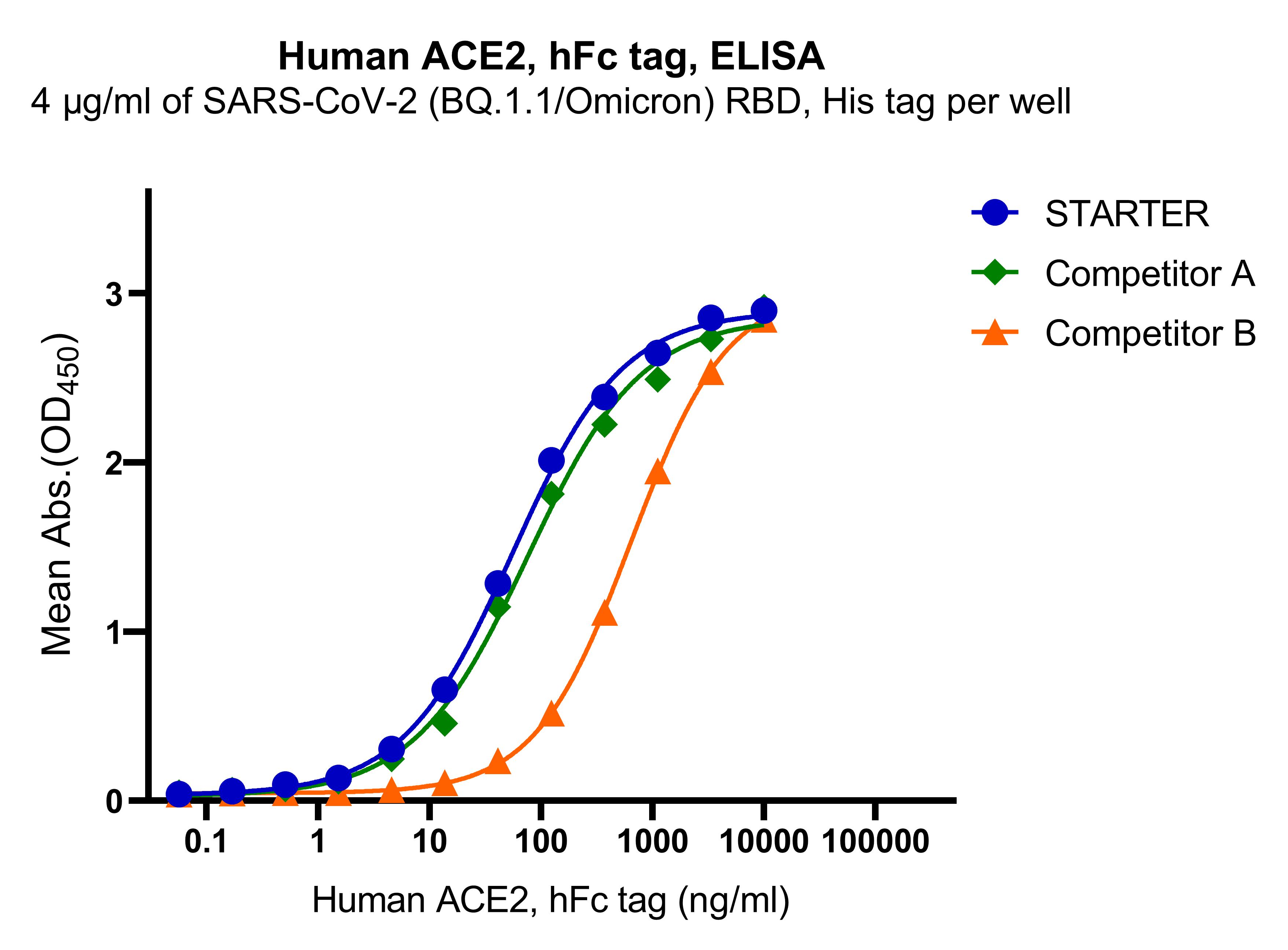 2. Immobilized SARS-CoV-2 (BA.2.12.1/Omicron) S protein, His Tag (S0A2011) at 4 μg/mL (50 μL/well) can bind Human ACE2, hFc tag with EC50 of 7.713-10.39 ng/ ml.