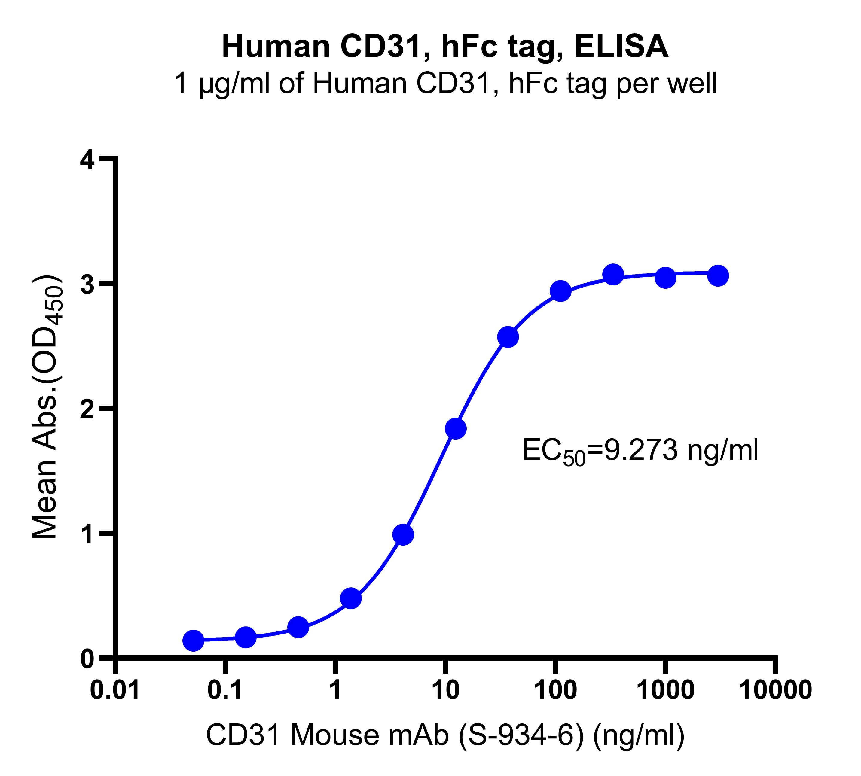 Immobilized Human CD31, hFc tag at 1 μg/mL (50 μL/well) can bind CD31 Mouse mAb (S-934-6) (Cat. No. S0B0551) with EC50 of 8.757-9.819 ng/ml.