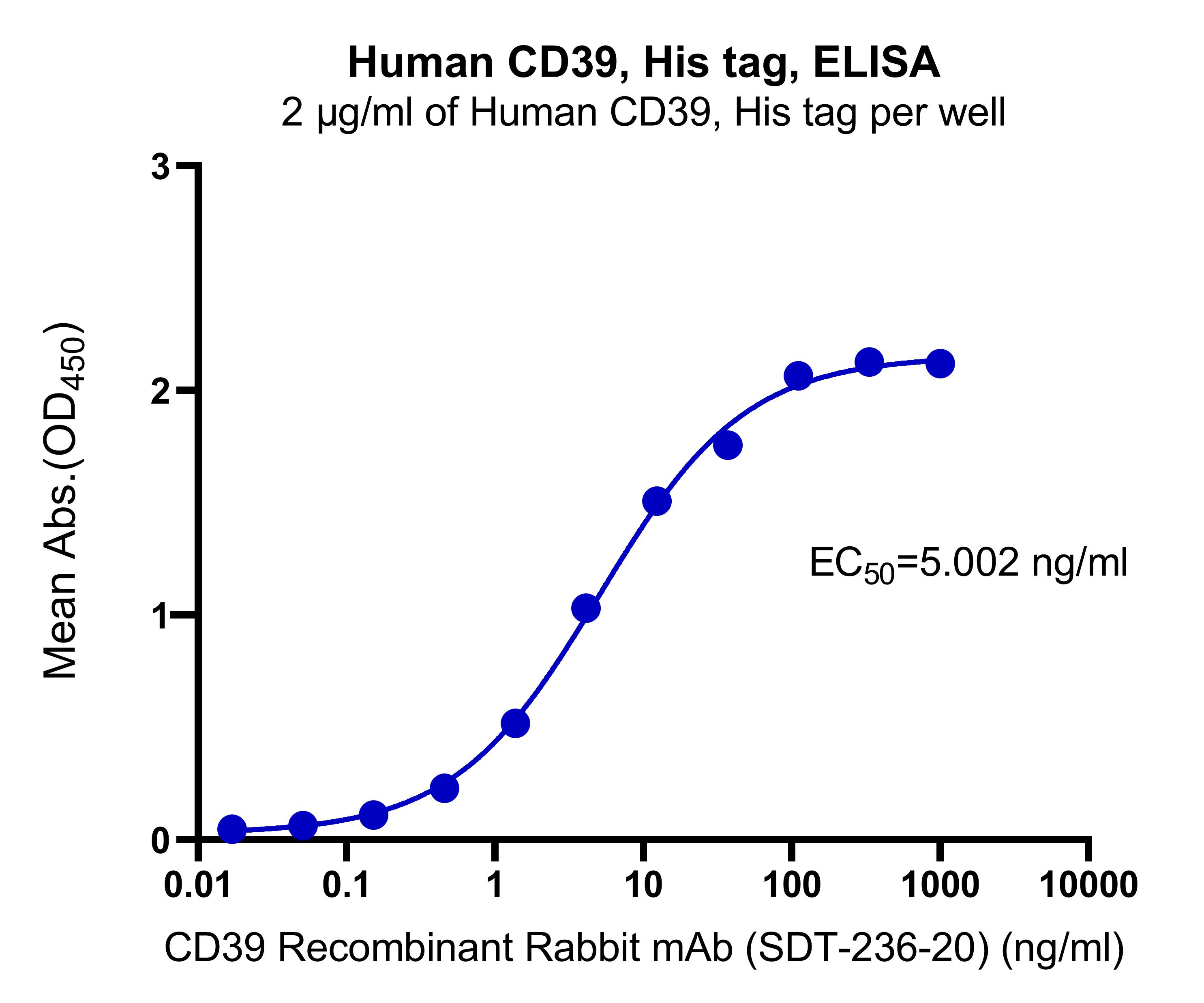 Immobilized Human CD39, His tag at 2 μg/mL (50 μL/well) can bind CD39 Recombinant Rabbit mAb (SDT-236-20) (S0B0050) with EC50 of 4.144-6.107 ng/ml.