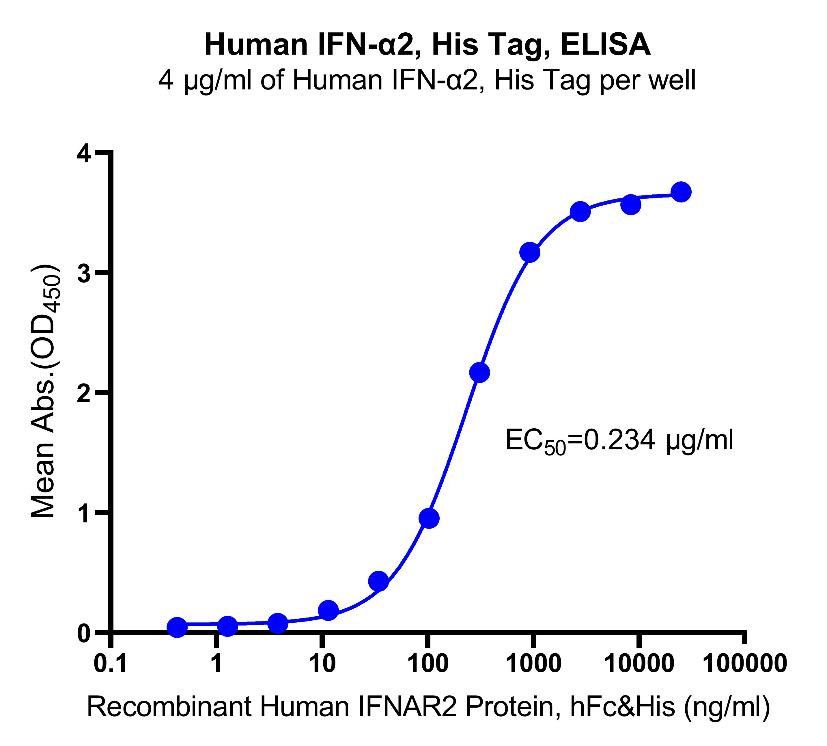 Immobilized Human IFN-α2, His Tag at 4 μg/mL (50 μL/well) can bind Recombinant Human IFNAR2 Protein with EC50 of 0.214-0.257 μg/ ml.