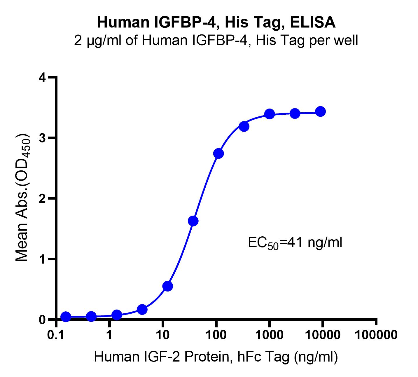 Immobilized Human IGFBP-4, His tag at 2 μg/mL (50 μL/well) can bind Human IGF-2 Protein, hFc Tag (Cat. No. S0A4045) with EC50 of 39.02-43.08 ng/ml.