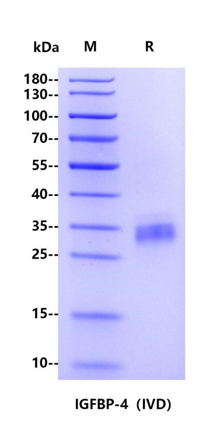 IGFBP-4 (insulin-like growth factor binding protein 4) binds to insulin-like growth factor 1 (IGF-1) and IGF-2 with high affinity and inhibits IGF effects in vitro. All members of the IGFBP family bind to IGF-I and IGF-II with approximately equal affinity, but IGFBP-4 binds to IGF2 better than IGF1. It contains a N-terminal domain of IGFBP and a thyroglobulin 1 type domain. IGFBP prolongs the half-life of insulin-like growth factor and has been shown to inhibit or stimulate the stimulative effects of insulin-like growth factor on cell culture. They alter the interaction of IGF with its cell surface receptors. IGFBP-4 is a unique protein that consistently inhibits multiple cancer cells in vivo and in vitro.This product is the recombinant human IGFBP-4 protein expressed from human 293 cells (HEK293).