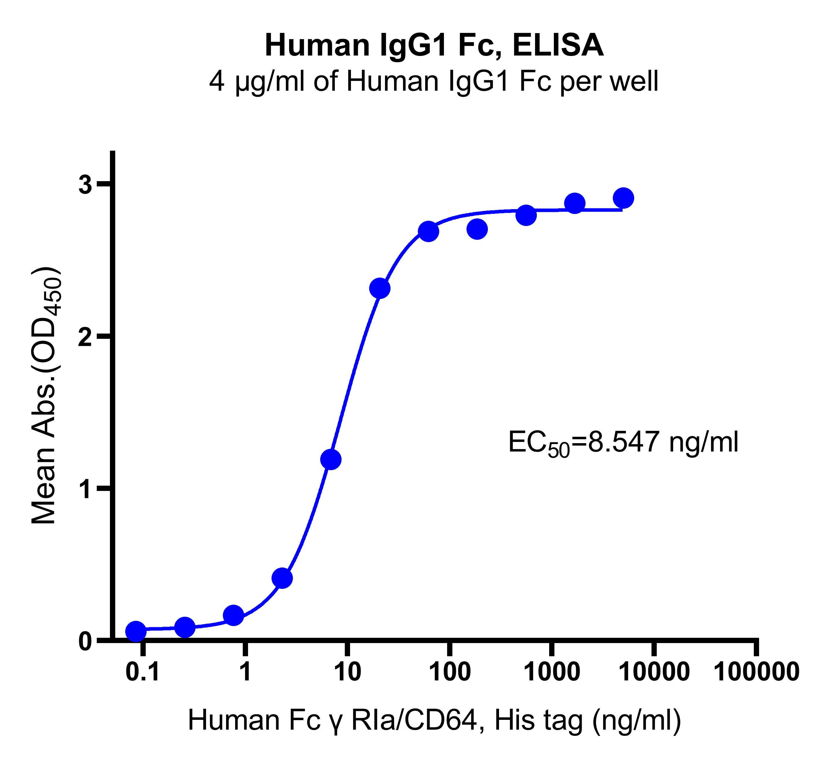 Immobilized Human IgG1 Fc at 4 μg/mL (50 μL/well) can bind Human Fc γ RIa/CD64, His tag (S0A1105) with EC50 of 7.520-9.702 ng/ml.