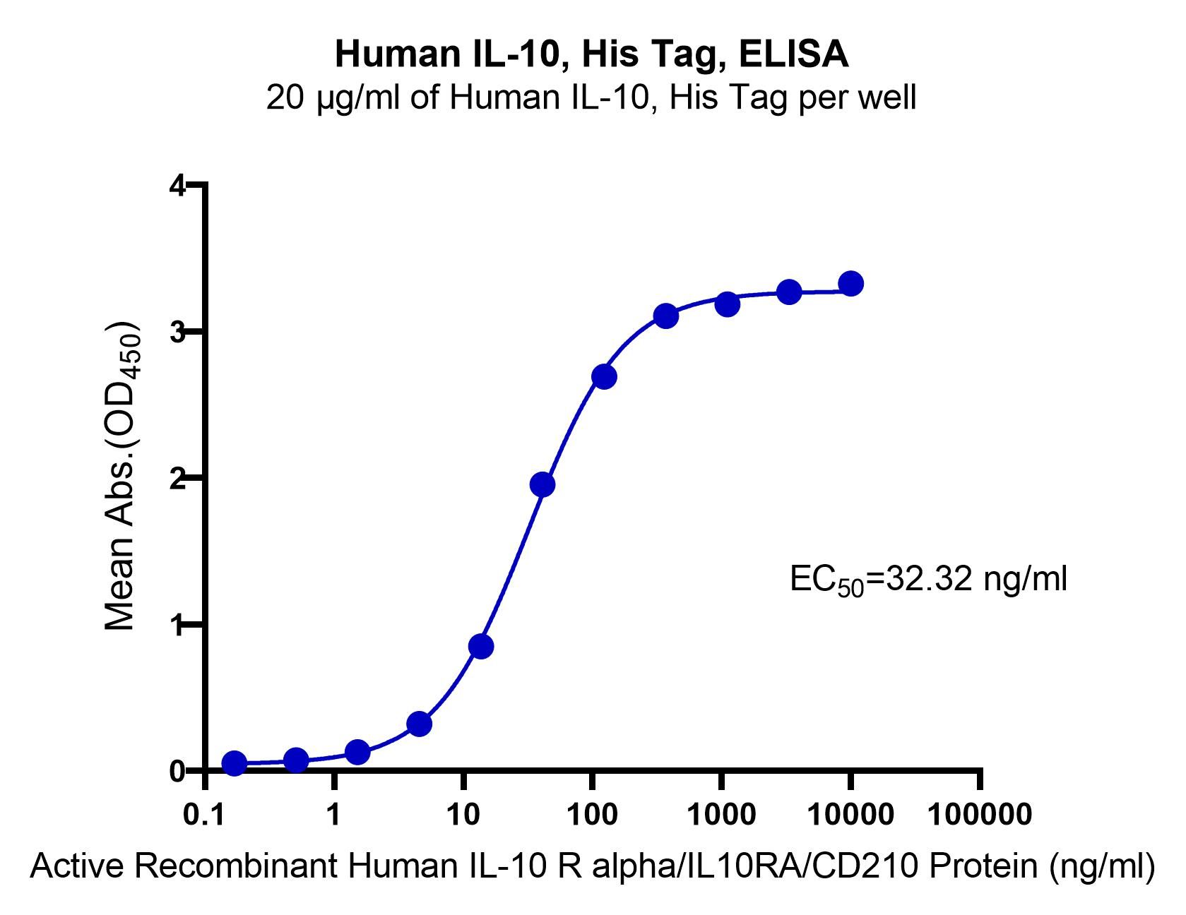 Immobilized Human IL-10, His Tag at 20 μg/mL (50 μL/well) can bind Active Recombinant Human IL-10 R alpha/IL10RA/CD210 Protein with EC50 of 29.35-35.61 ng/mL.