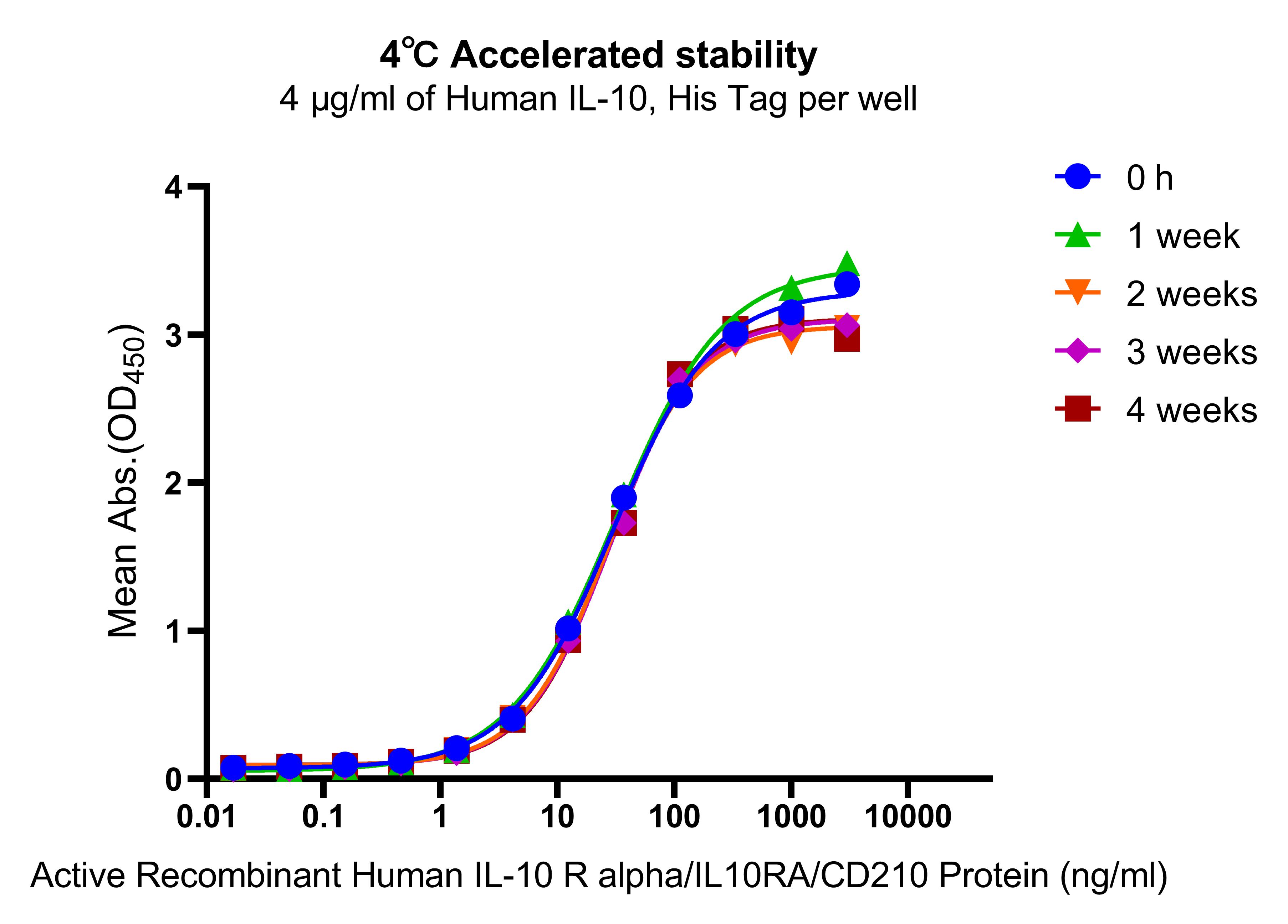 The ELISA based assay shows that Human IL-10, His Tag (S0A4001) is stable at 4°C for 4 weeks.