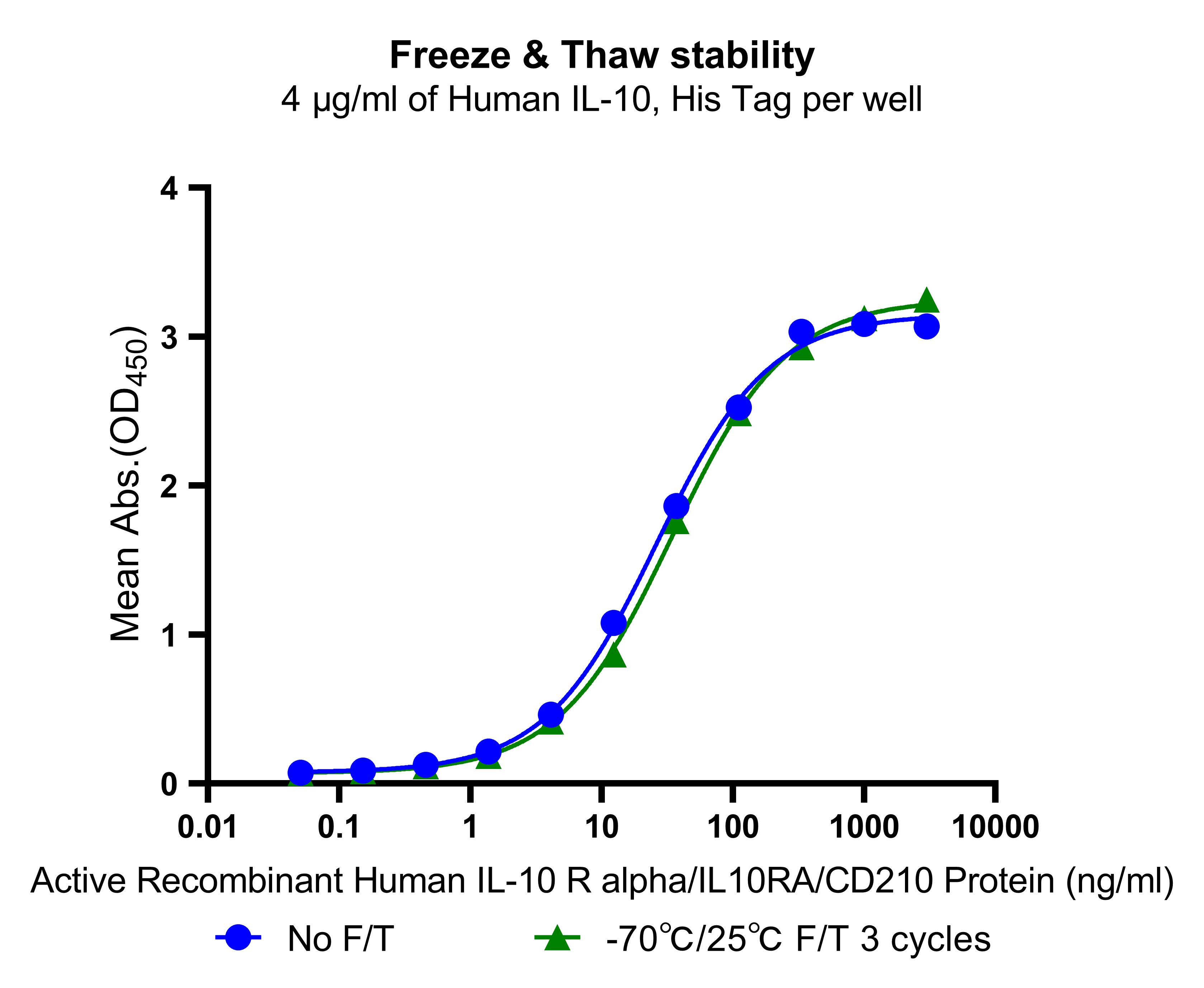 The ELISA based assay shows that Human IL-10, His tag is stable after freezing and thawing 3 times.