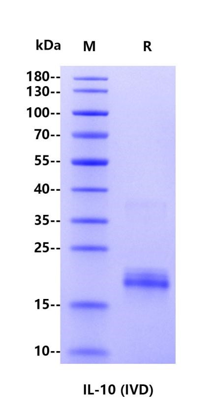 IL-10 (Interlukin-10) is a multicellular and multifunctional cytokine that regulates cell growth and differentiation, participates in inflammatory and immune responses, and is recognized as an inflammatory and immunosuppressive factor. It plays an important role in tumor, infection, organ transplantation, hematopoietic system and cardiovascular system, and is closely related to diseases of blood, digestion, especially cardiovascular system.Overexpression of IL-10 leads to skin leishmaniasis, and IL-10 plays a decisive role in the development of immune paralysis, temporary immune deficiency after trauma, major surgery, burns, shock and high risk bacterial/fungal infections that can be fatal. Macrophage-derived IL-10 is also associated with age-related immune deficiency.Continuous immune activation occurs when IL-10 is relatively or absolutely deficient, which can lead to chronic inflammatory bowel diseases (such as Crohn's disease), psoriasis, rheumatoid arthritis and post-transplant disease, etc.This product is the recombinant human IL-10 protein expressed from human 293 cells (HEK293).