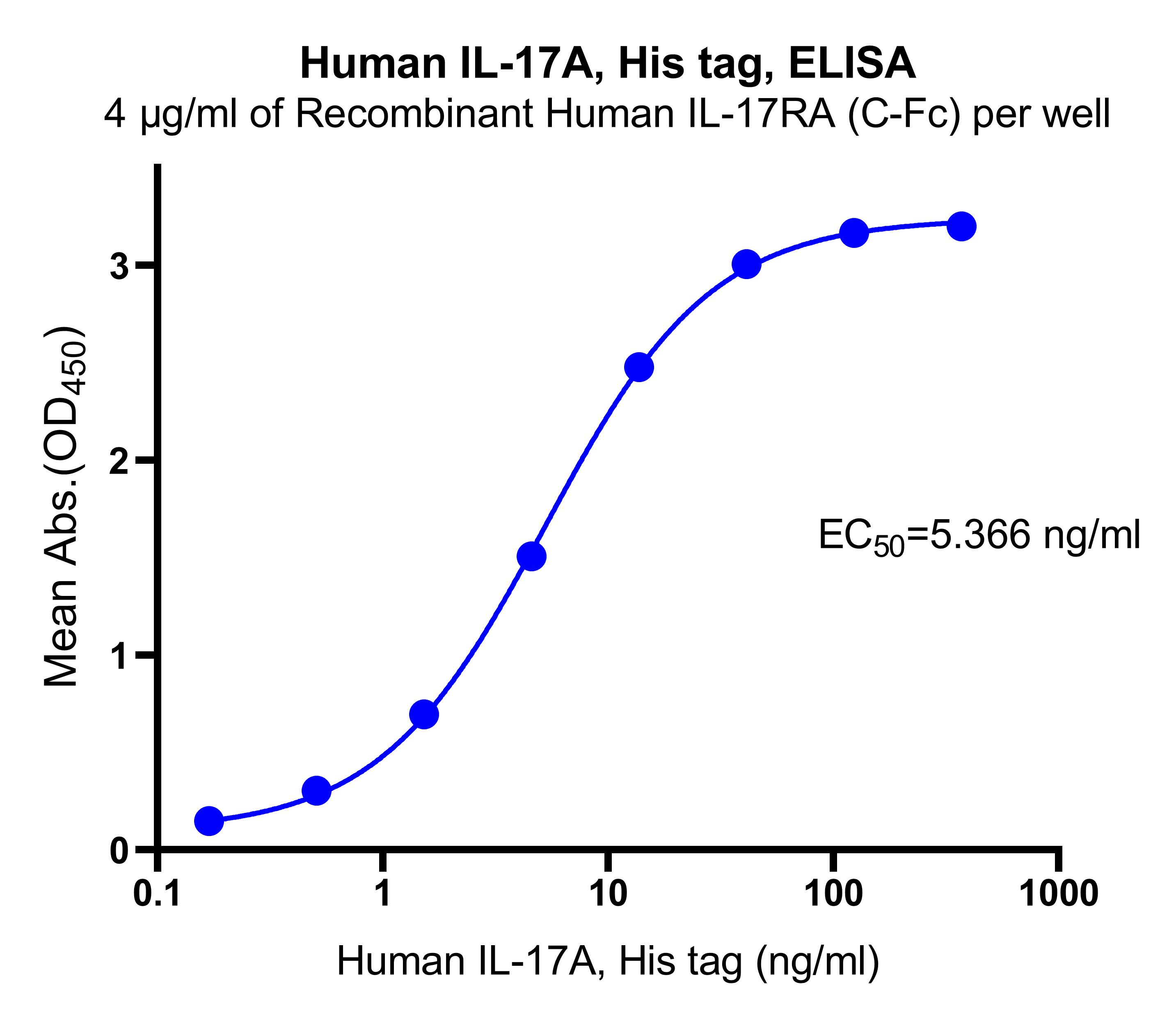 Immobilized Recombinant Human IL-17RA (C-Fc) at 4 μg/mL (50 μL/well) can bind Human IL-17A, His tag with EC50 of 5.019-5.731 ng/ml.