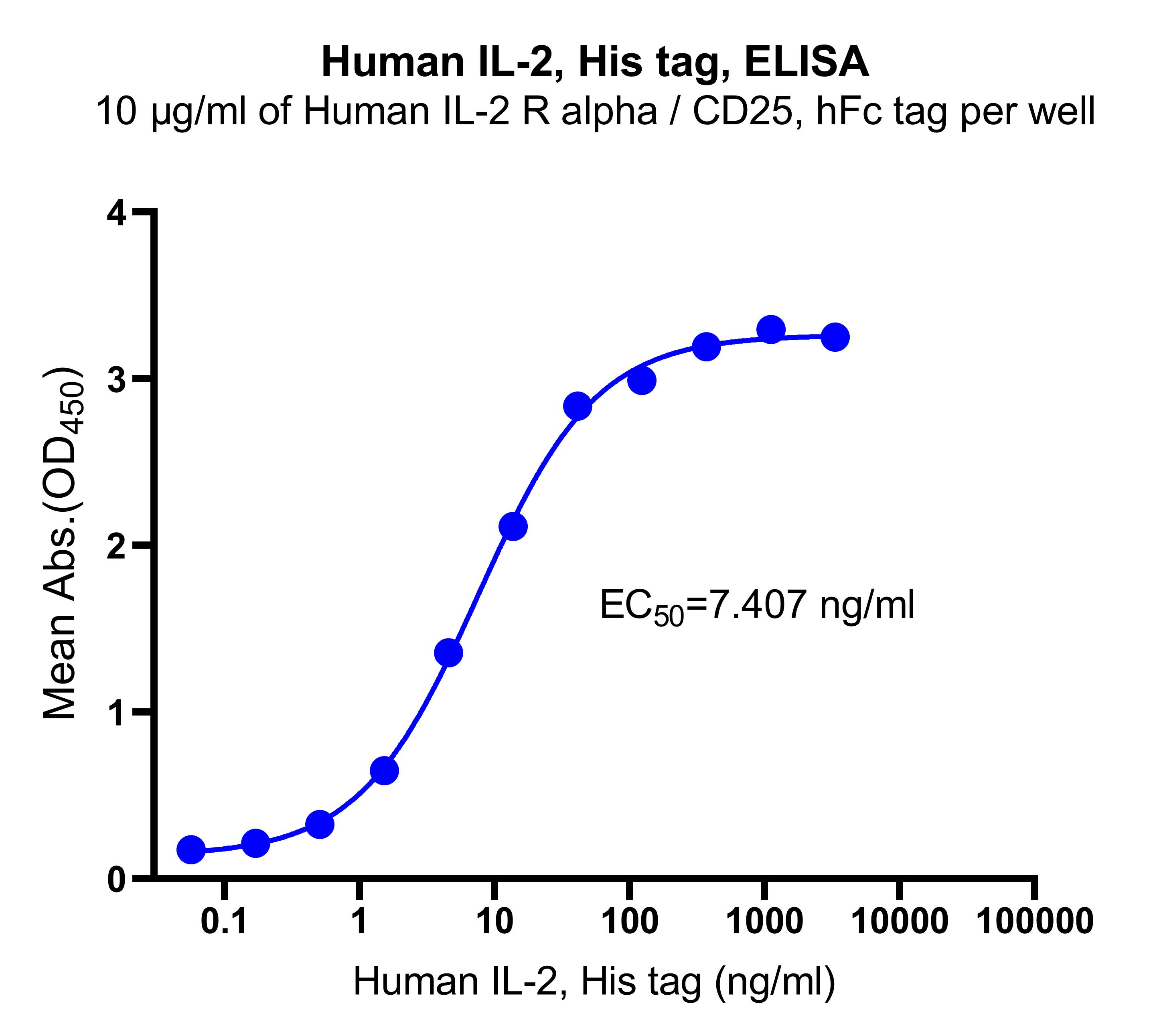 Immobilized Human IL-2R alpha/CD25, hFc tag at 10 μg/mL (50 μL/well) can bind Human IL-2, His tag with EC50 of 6.418-8.526 ng/ ml.