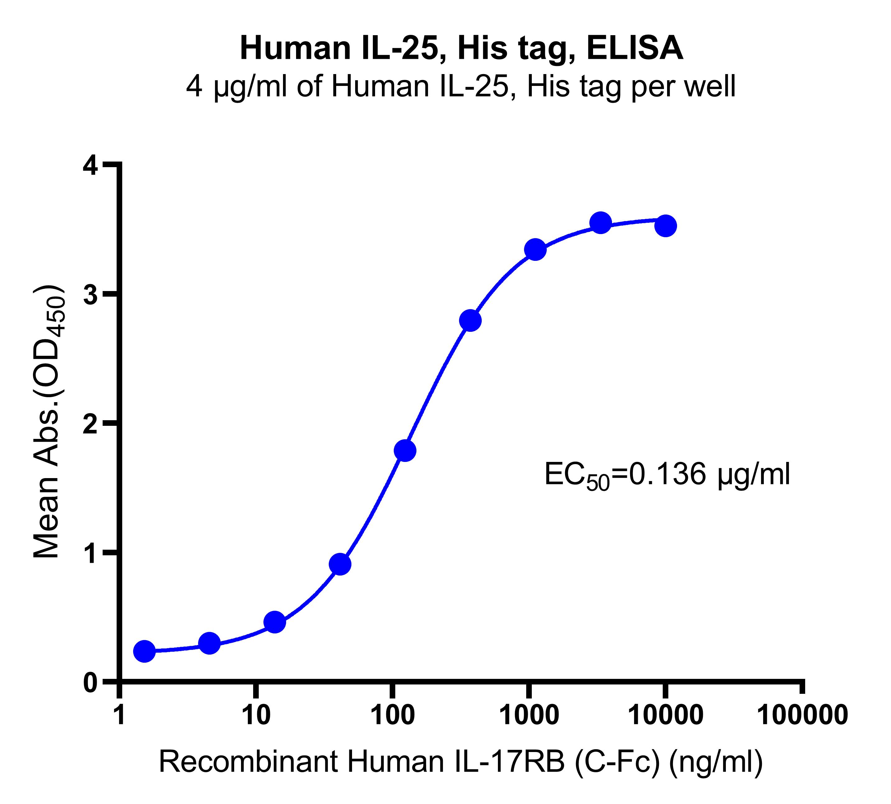 Immobilized Human IL-25, His tag at 4 μg/mL (50 μL/well) can bind Recombinant Human IL-17RB (C-Fc) with EC50 of 0.129-0.142 μg/ ml.