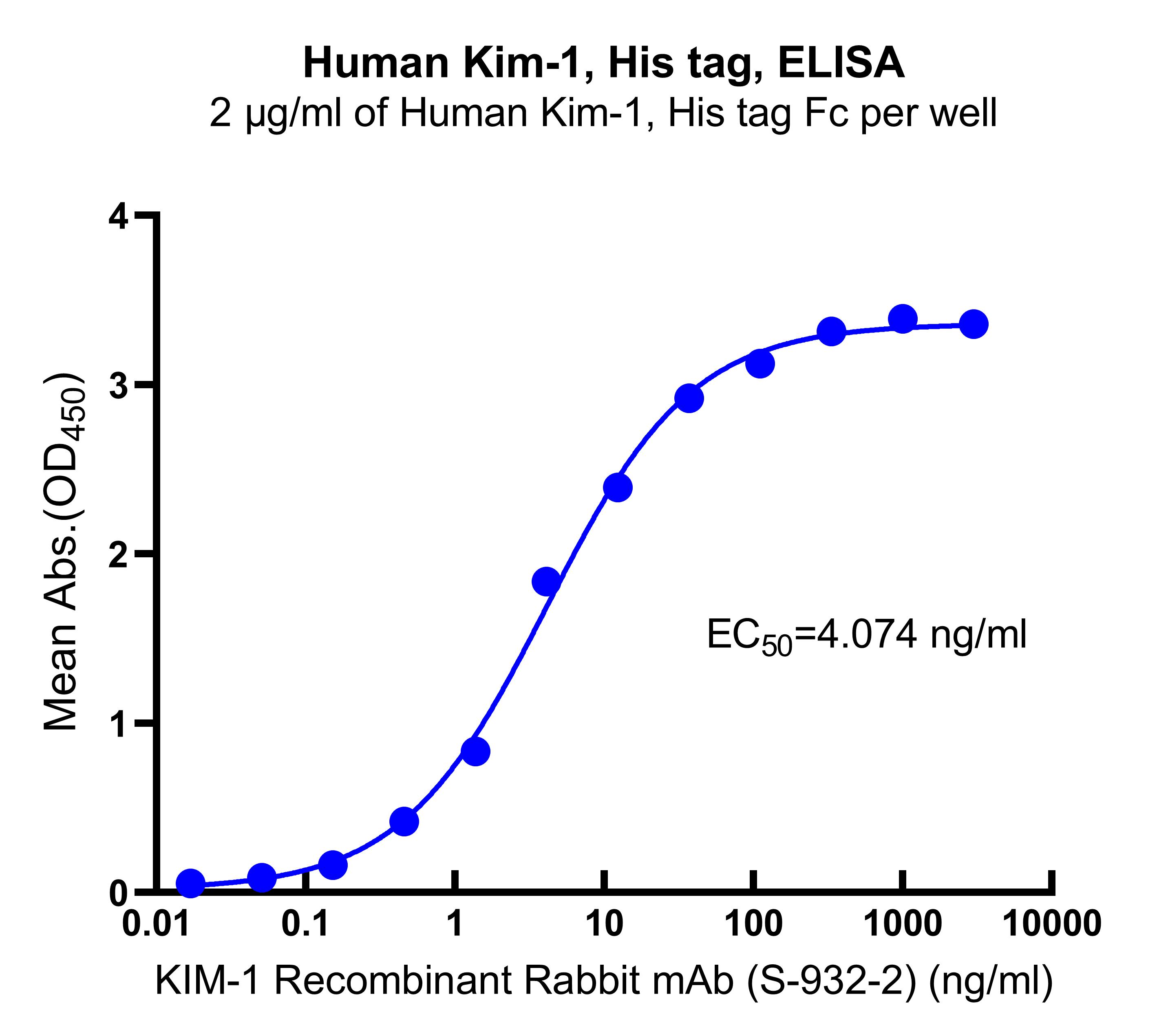 Immobilized Human Kim-1, His tag at 2 μg/mL (50 μL/well) can bind KIM-1 Recombinant Rabbit mAb (S-932-2) (Cat. No. S0B0604) with EC50 of 3.341-4.967 ng/ ml.