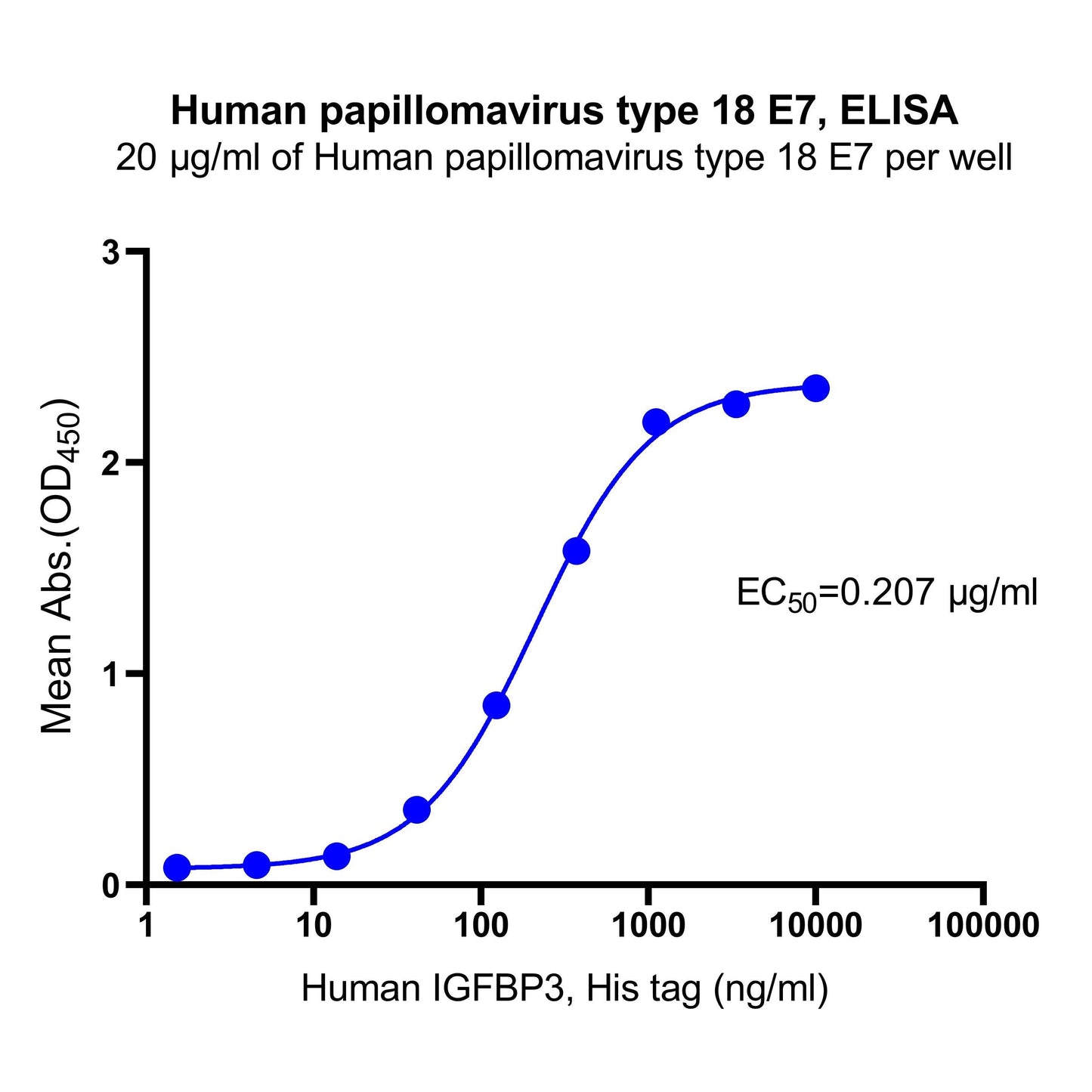 Immobilized Human papillomavirus type 18 E7 at 20 μg/mL (50 μL/well) can bind Human IGFBP3, His tag (S0A3002) with EC50 of 0.185-0.230 μg/ml.