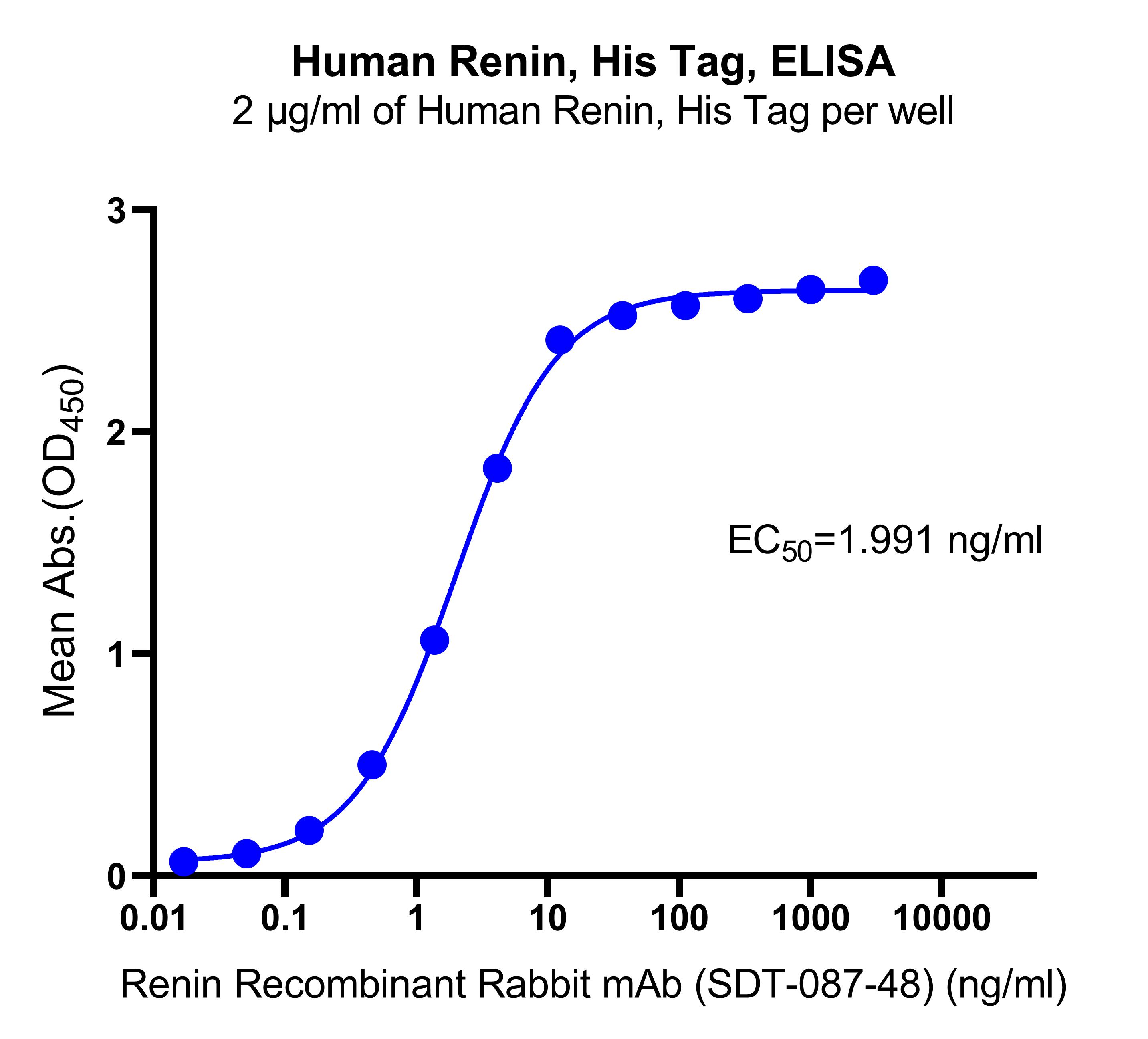 Immobilized Human Renin, His Tag at 2 μg/mL (50 μL/well) can bind Renin Recombinant Rabbit mAb (SDT-087-48) (S0B2149) with EC50 of 1.786-2.215 ng/ml.
