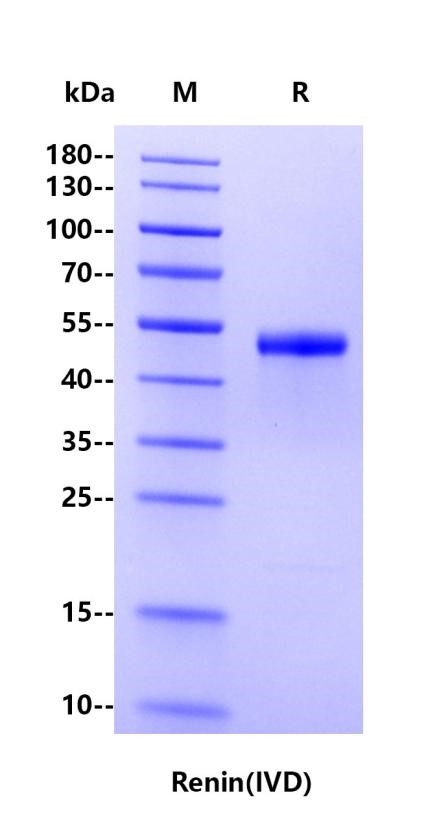 Renin, also known as angiotensinogen enzyme, is a proteolytic enzyme released by paraspheroidal granulosa cells and is part of the renin-angiotensin system. Renin acts on plasma angiotensingen to produce inactive angiotensin I, which is hydrolyzed to active angiotensin II under the action of angiotensin converting enzyme. Angiotensin II can cause arteriolar vasoconstriction and promote the synthesis and secretion of aldosterone in adrenal cortex. Plasma Renin activity test can be used to diagnose primary aldosteronism and hypertension.This product is the recombinant human Renin protein expressed from human 293 cells (HEK293).