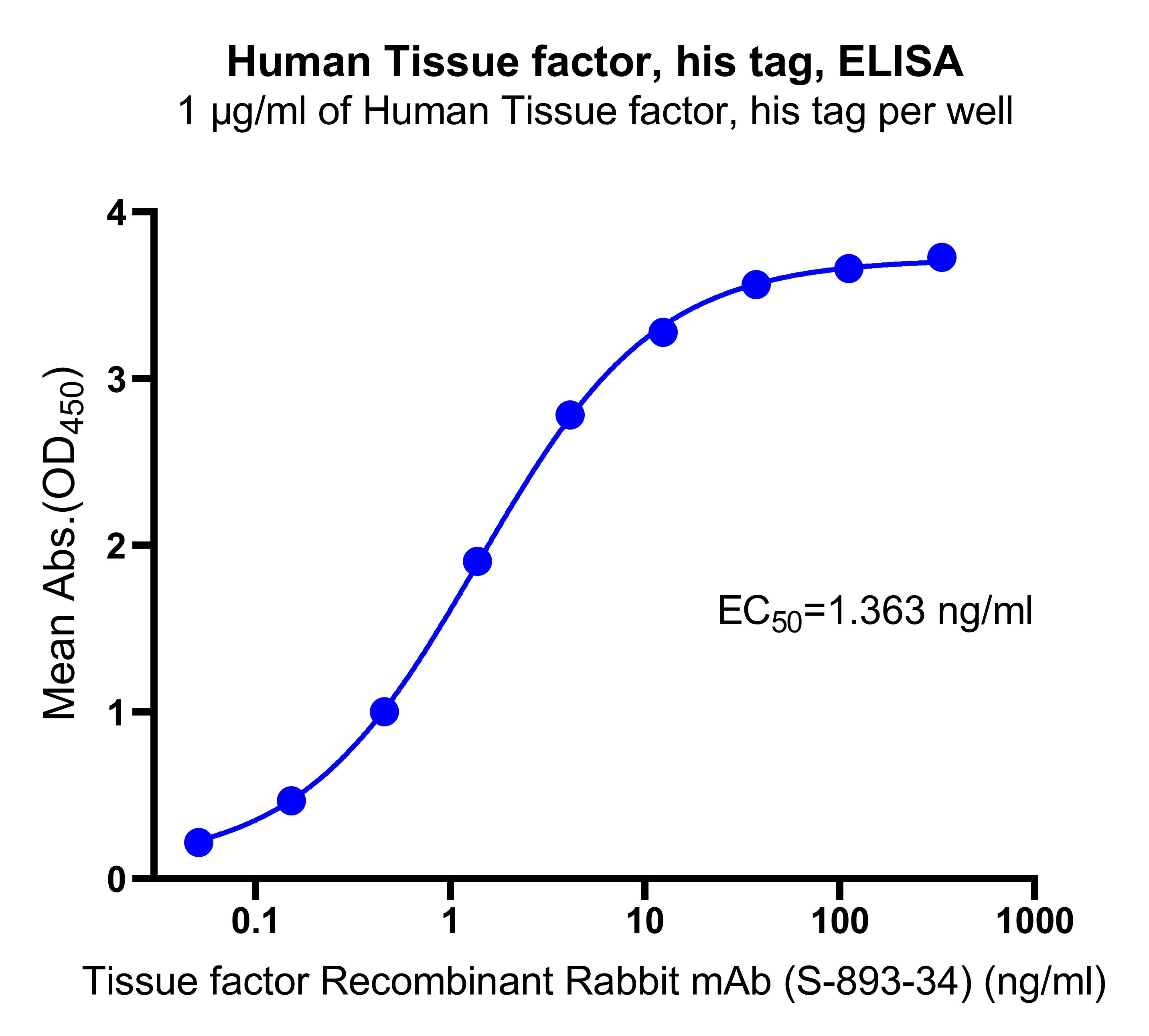 Immobilized Human Tissue factor, his tag at 1 μg/mL (50 μL/well) can bind Tissue factor Recombinant Rabbit mAb (S-893-34) with EC50 of 1.265-1.463 ng/ ml.