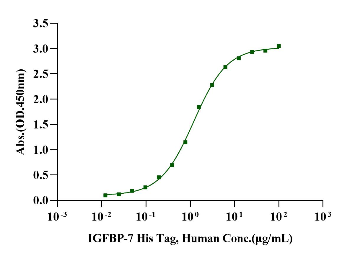Immobilized C1qR1/CD93 Fc Chimera Protein, Human (Cat. No. UA011087) at 5.0μg/mL (100μL/well) can bind IGFBP-7 His Tag, Human (Cat. No. UA010394) with EC50 of 1.12-1.31μg/mL .