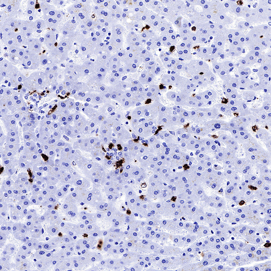IHC shows positive staining in paraffin-embedded human liver. Anti-MPO antibody was used at 1/1000 dilution, followed by a HRP Polymer for Mouse & Rabbit IgG (ready to use). Counterstained with hematoxylin. Heat mediated antigen retrieval with Tris/EDTA buffer pH9.0 was performed before commencing with IHC staining protocol.