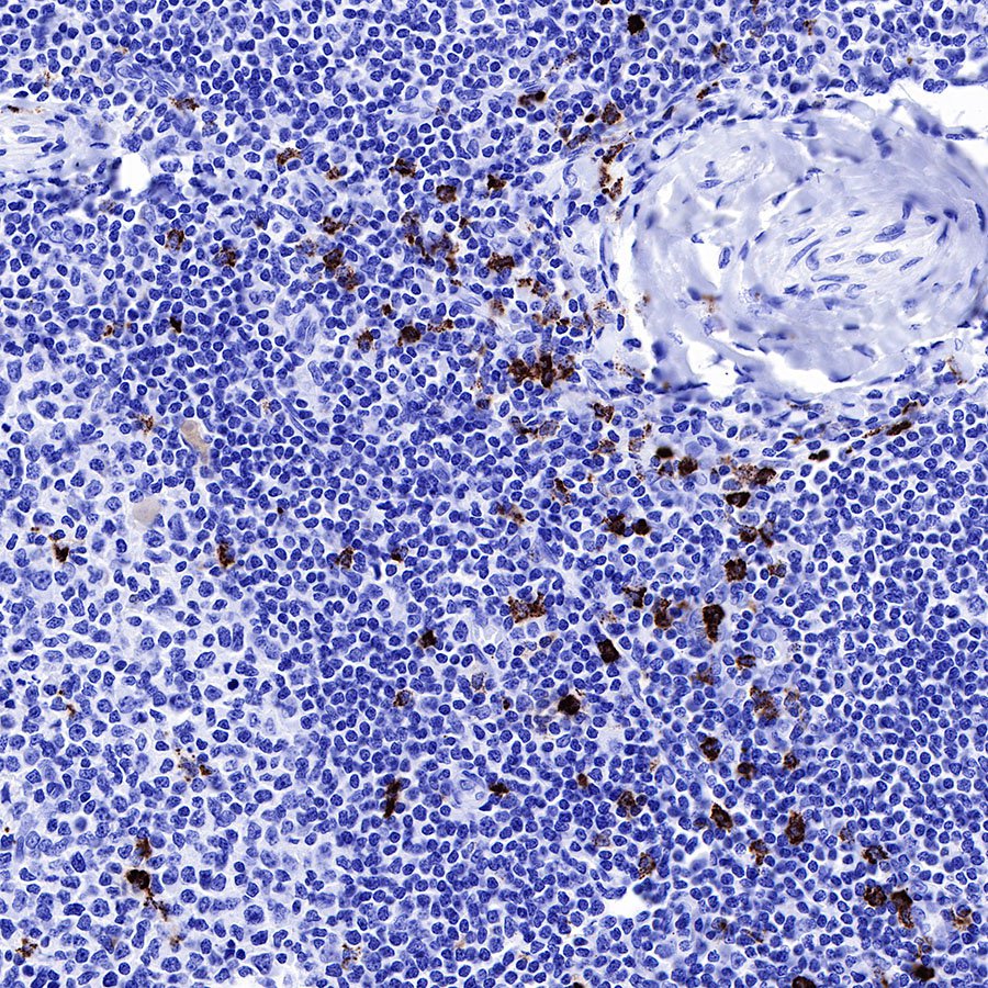 IHC shows positive staining in paraffin-embedded human tonsil. Anti-MPO antibody was used at 1/1000 dilution, followed by a HRP Polymer for Mouse & Rabbit IgG (ready to use). Counterstained with hematoxylin. Heat mediated antigen retrieval with Tris/EDTA buffer pH9.0 was performed before commencing with IHC staining protocol.