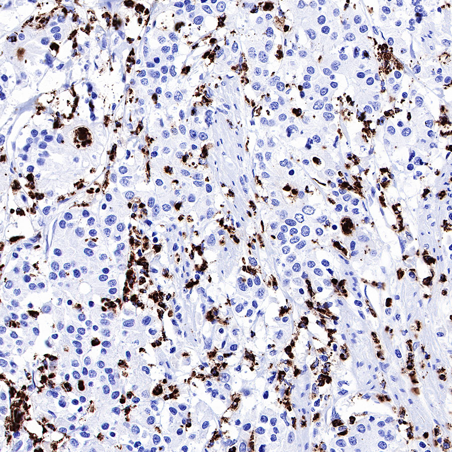 IHC shows positive staining in paraffin-embedded human gastric cancer. Anti-MPO antibody was used at 1/1000 dilution, followed by a HRP Polymer for Mouse & Rabbit IgG (ready to use). Counterstained with hematoxylin. Heat mediated antigen retrieval with Tris/EDTA buffer pH9.0 was performed before commencing with IHC staining protocol.