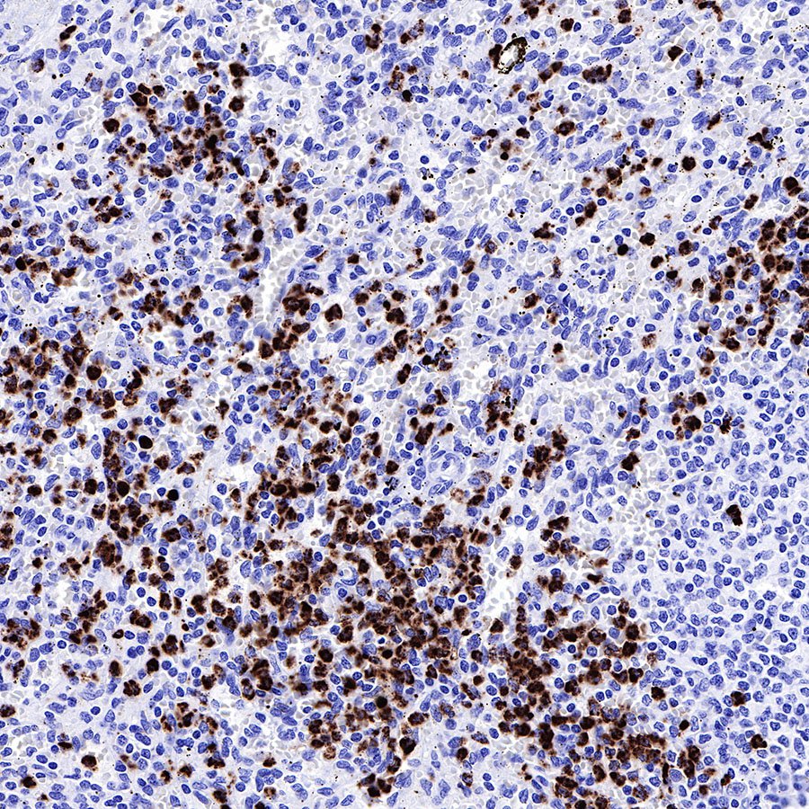 IHC shows positive staining in paraffin-embedded human spleen. Anti-MPO antibody was used at 1/1000 dilution, followed by a HRP Polymer for Mouse & Rabbit IgG (ready to use). Counterstained with hematoxylin. Heat mediated antigen retrieval with Tris/EDTA buffer pH9.0 was performed before commencing with IHC staining protocol.