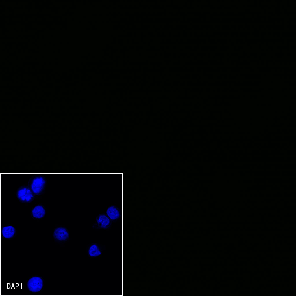 Negative control:ICC shows negative staining in vector-transfected 293T cells (below panel). Anti-Myc tag (Alexa Fluor® 488 Conjugate) antibody was used at 1/500 dilution and incubated overnight at 4°C. The cells were fixed with 100% ice-cold methanol and permeabilized with 0.1% PBS-Triton X-100. Nuclei were counterstained with DAPI (Blue).