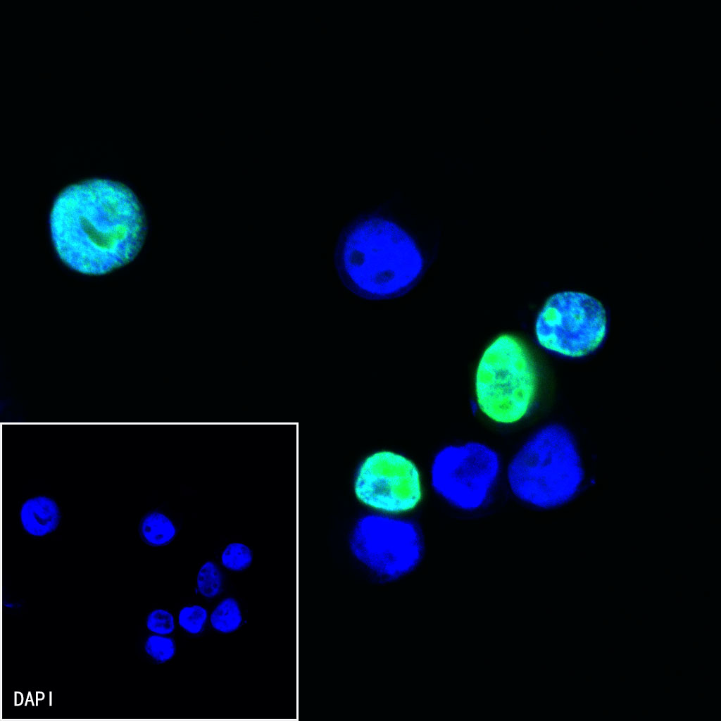 ICC shows positive staining in Histone H3-GST Tag-HA Tag-Myc tag transfected 293T cells. Anti-Myc tag (Alexa Fluor® 488 Conjugate) antibody was used at 1/500 dilution (Green) and incubated overnight at 4°C. The cells were fixed with 100% ice-cold methanol and permeabilized with 0.1% PBS-Triton X-100. Nuclei were counterstained with DAPI (Blue).