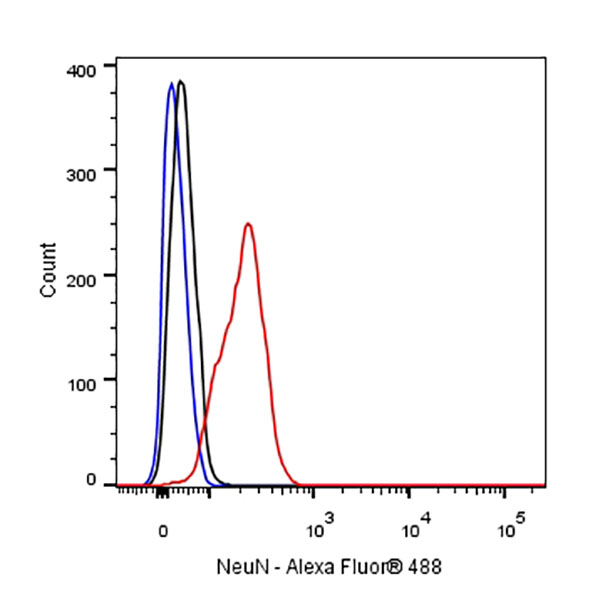Flow cytometric analysis of 4% PFA fixed 90% methanol permeabilized SH-SY5Y (Human neuroblastoma epithelial cell) cells labelling NeuN antibody at 1/500 (0.1 μg) dilution / (red) compared with a Rabbit monoclonal IgG (Black) isotype control and an unlabelled control (cells without incubation with primary antibody and secondary antibody) (Blue). Goat Anti - Rabbit IgG Alexa Fluor® 488 was used as the secondary antibody.