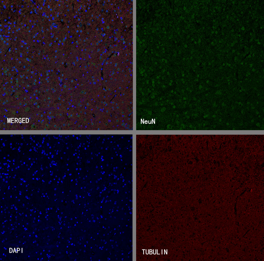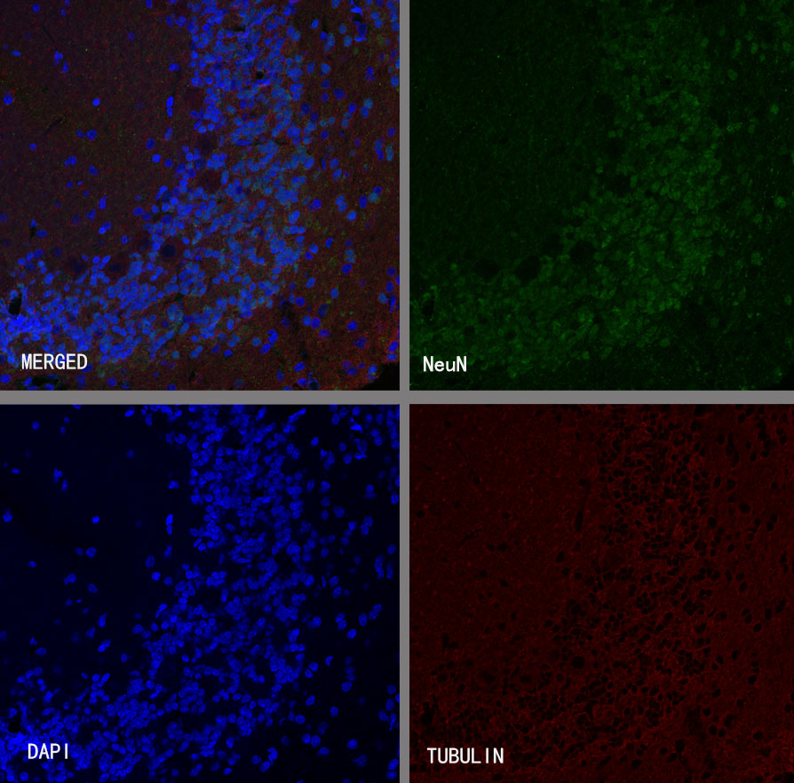 IF shows positive staining in paraffin-embedded mouse cerebellum. Anti-NeuN antibody was used at 1/100 dilution (Green) and incubated overnight at 4°C. Goat polyclonal Antibody to Rabbit IgG - H&L (Alexa Fluor® 488) was used as secondary antibody at 1/1000 dilution. Counterstained with DAPI (Blue). Counterstain with tubulin (Red).Heat mediated antigen retrieval with EDTA buffer pH9.0 was performed before commencing with IF staining protocol.
