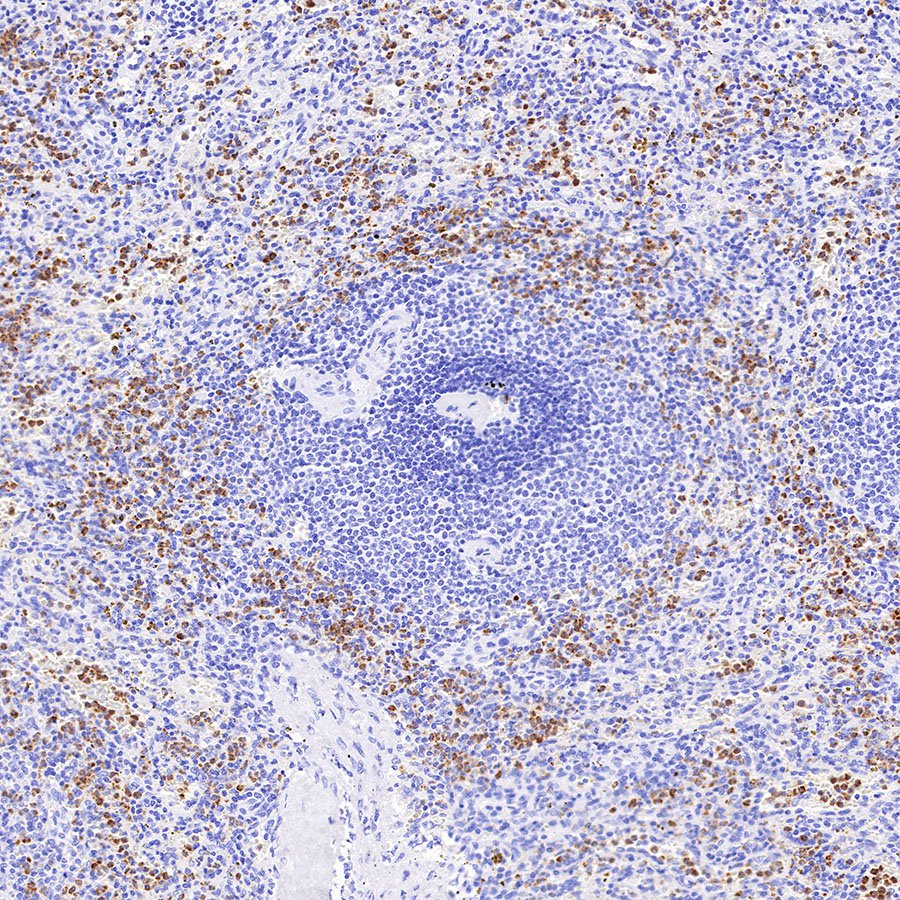 IHC shows positive staining in paraffin-embedded human spleen. Anti-Neutrophil Elastase antibody was used at 1/500 dilution, followed by a HRP Polymer for Mouse & Rabbit IgG (ready to use). Counterstained with hematoxylin. Heat mediated antigen retrieval with Tris/EDTA buffer pH9.0 was performed before commencing with IHC staining protocol.