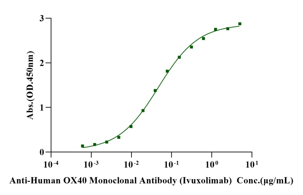 Immobilized OX40/TNFRSF4/CD134 His Tag, Cynomolgus (Cat. No. UA010842)at 2.0μg/mL (100μL/well) can bind Anti-Human OX40 Monoclonal Antibody (Ivuxolimab) with EC50 of 44.11-54.17ng/mL.
