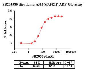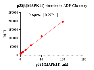 The p38β(MAPK11) activity was detected using Ultra Luminescence technology. The reaction was performed by incubating the p38β(MAPK11) protein , ATP and substrate at 25℃ for 60 min, then adding ADP-Glo reagent and reading RLU with BMG.