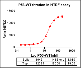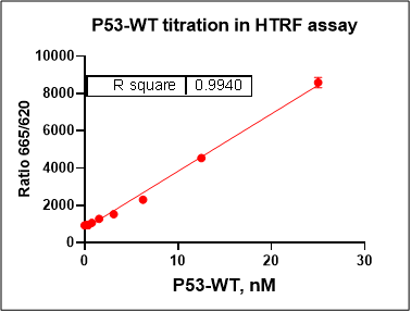 The P53 activity was detected using HTRF technology. The reaction was performed by incubating the P53 protein, dsDNA and beads at 25℃ for 60 min, then reading ratio 665/620 with BMG.