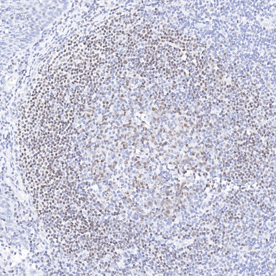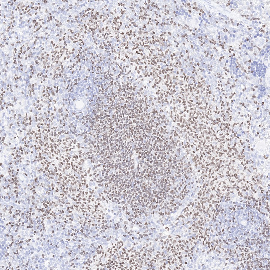 IHC shows positive staining in paraffin-embedded human tonsil. Anti-PAX5 antibody was used at 1/100 dilution, followed by a Goat Anti-Rabbit IgG H&L (HRP) ready to use.
