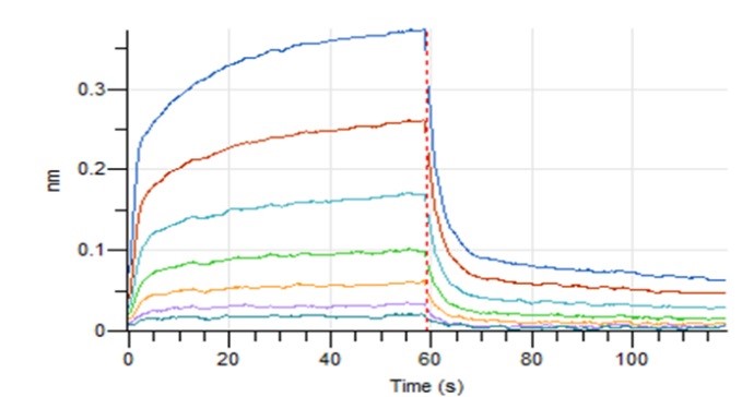 Loaded PD-1 Fc Chimera, Human (Cat. No. UA010002) on Protein A Biosensor, can bind PD-L1 His Tag, Human (Cat. No.UA010001) with an affinity constant of 1.3 μM as determined in BLI assay.