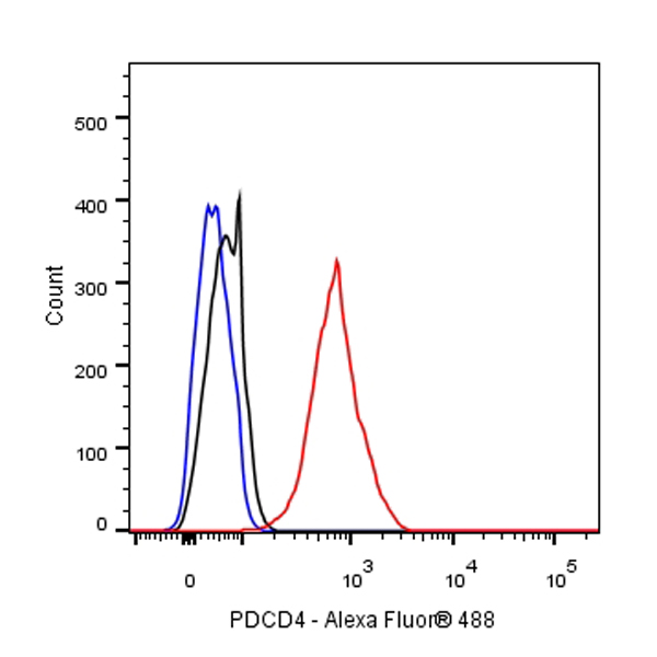 Flow cytometric analysis of 4% PFA fixed 90% methanol permeabilized HeLa (Human cervix adenocarcinoma epithelial cell) cells labelling PDCD4 antibody at 1/500 dilution (0.1 μg)/ (Red) compared with a Rabbit monoclonal IgG (Black) isotype control and an unlabelled control (cells without incubation with primary antibody and secondary antibody) (Blue). Goat Anti - Rabbit IgG Alexa Fluor® 488 was used as the secondary antibody.