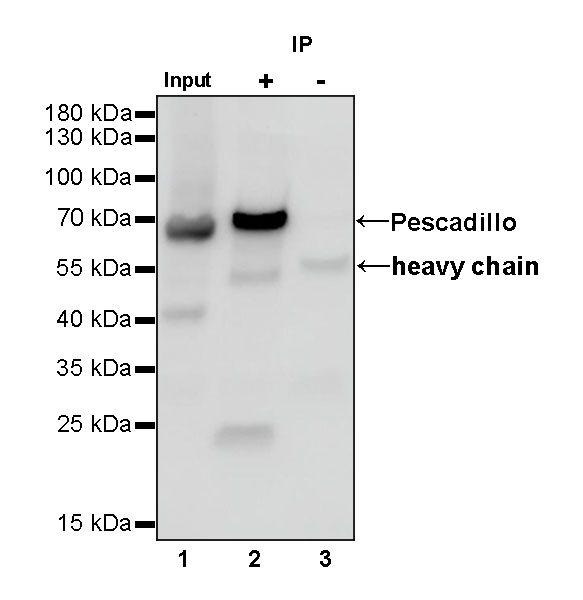 Western blot was performed on the immunoprecipitate using PES1 Rat mAb at 1/1000 dilution.