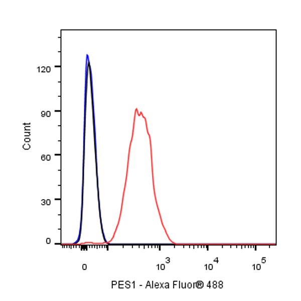 Flow cytometric analysis of 4% PFA fixed 90% methanol permeabilized HeLa (Human cervix adenocarcinoma epithelial cell) cells labeling PES1 at 1/500 dilution (0.1 μg) / (red) compared with a Rat monoclonal IgG isotype control (black) and an unlabeled control (cells without incubation with primary antibody and secondary antibody) (Blue). Goat Anti - Rat IgG Alexa Fluor® 488 was used as the secondary antibody.
