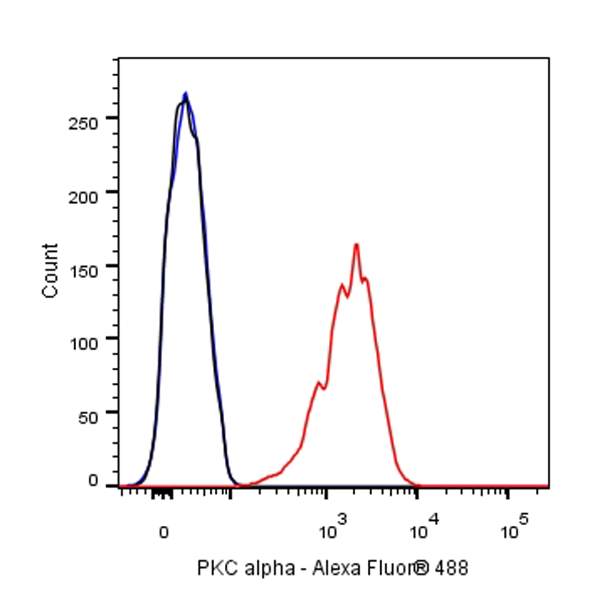 Flow cytometric analysis of 4% PFA fixed 90% methanol permeabilized SH-SY5Y (Human neuroblastoma epithelial cell) labelling PKC alpha antibody at 1/500 dilution (0.1 μg)/ (Right) compared with a Rabbit monoclonal IgG / (Left) isotype control. Goat Anti - Rabbit IgG Alexa Fluor® 488 was used as the secondary antibody.