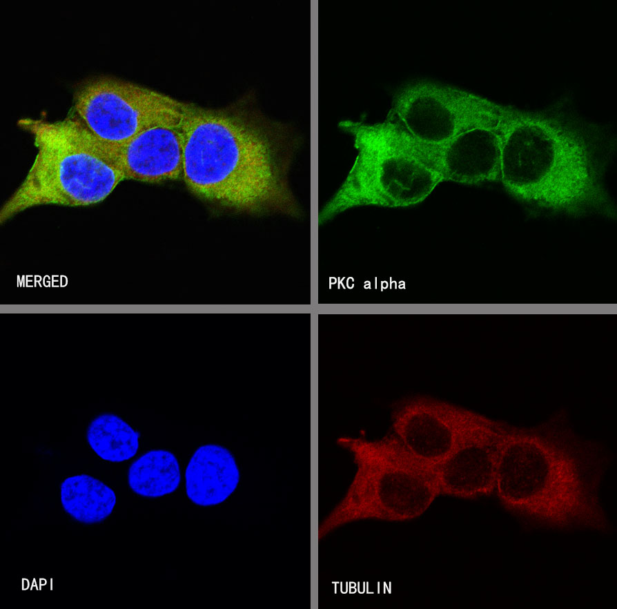 ICC shows positive staining in SH-SY5Y cells. Anti-PKC alpha antibody was used at 1/500 dilution (Green) and incubated overnight at 4°C. Goat polyclonal Antibody to Rabbit IgG - H&L (Alexa Fluor® 488) was used as secondary antibody at 1/1000 dilution. The cells were fixed with 100% ice-cold methanol and permeabilized with 0.1% PBS-Triton X-100. Nuclei were counterstained with DAPI (Blue).Counterstain with tubulin (red).